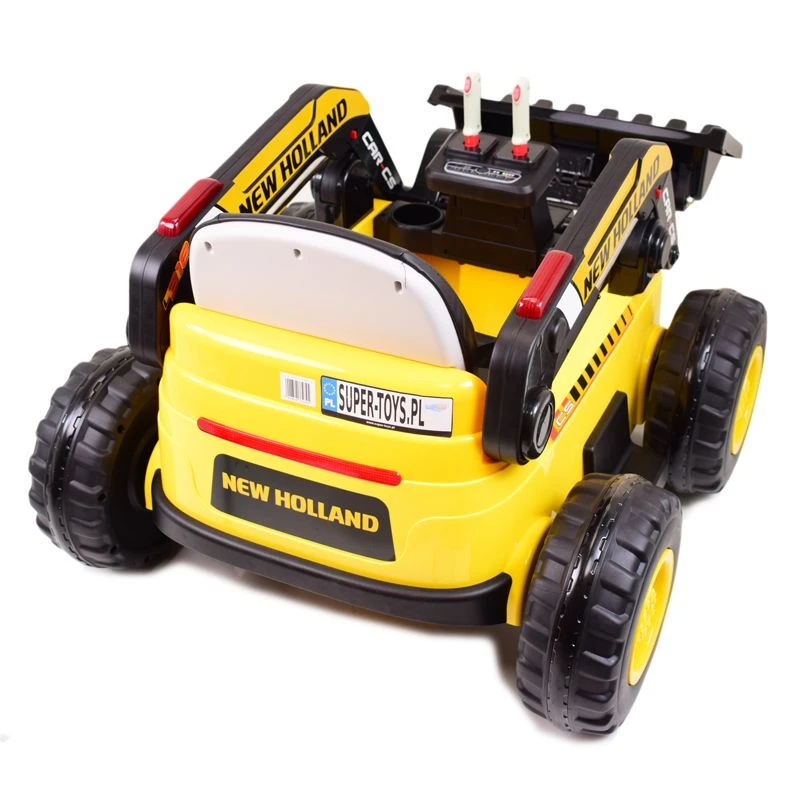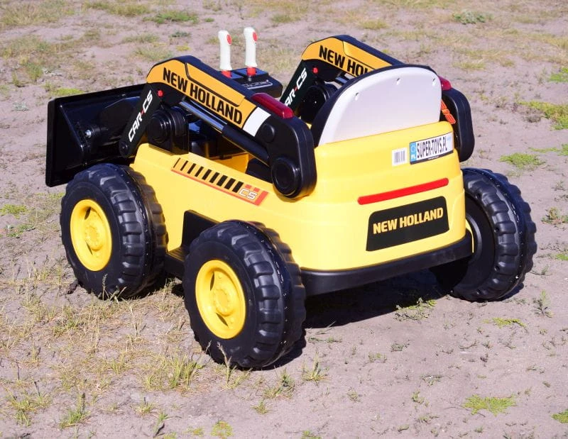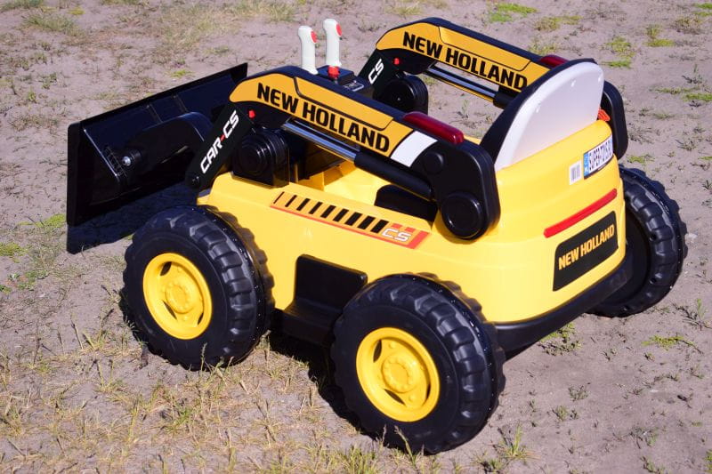 MEGA ŁADOWARKA NA AKUMUMULATOR NEW HOLLAND z pilotem i dźwiękami, napędzana CZTEREMA mocnymi silnikami 75 W z całą pewności zainteresuje młodego wielbiciela pojazdów budowlanych.