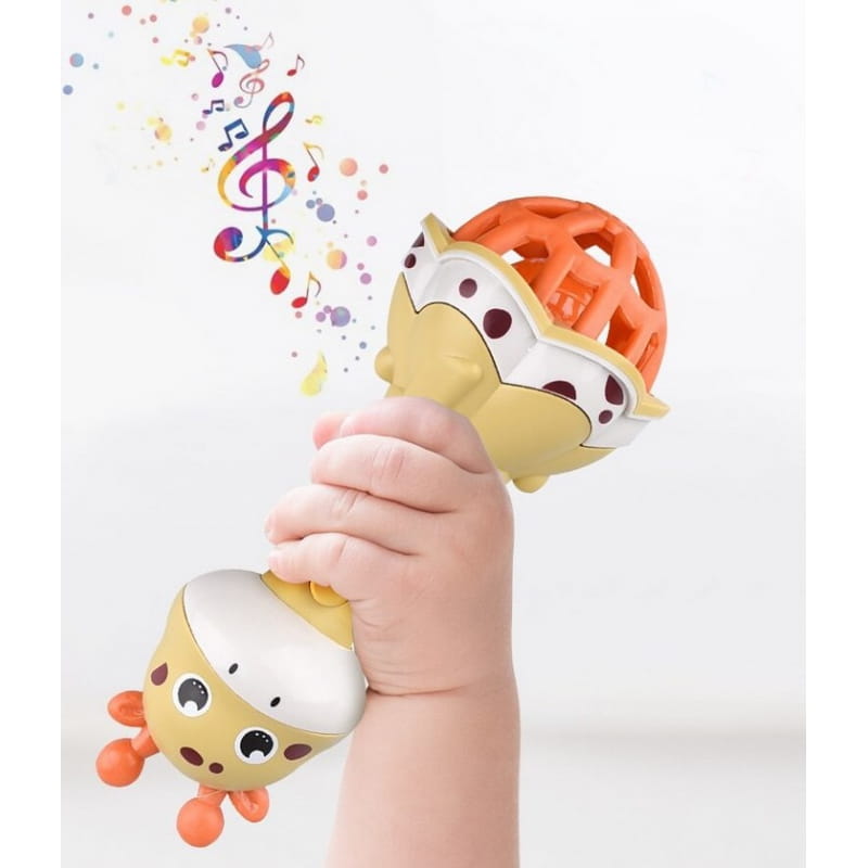 Grzechotka od marki WOOPIE to idealna zabawka na początek muzycznej podróży Twojego dziecka. To klasyczna i prosta zabawka muzyczna, a jednak wciąż dająca sporo możliwości. Posiada dodatkowo po wciśnięciu guzika funkcje świetlne i dźwiękowe w postaci uroczych melodii. Wydaje delikatny i miły dla ucha dźwięk. Guma u podstawy jest miękka i elastyczna. Zabawka pomoże ćwiczyć zdolności manualne i słuchowe twojej pociechy oraz wzmocni naturalne poczucie rytmu.