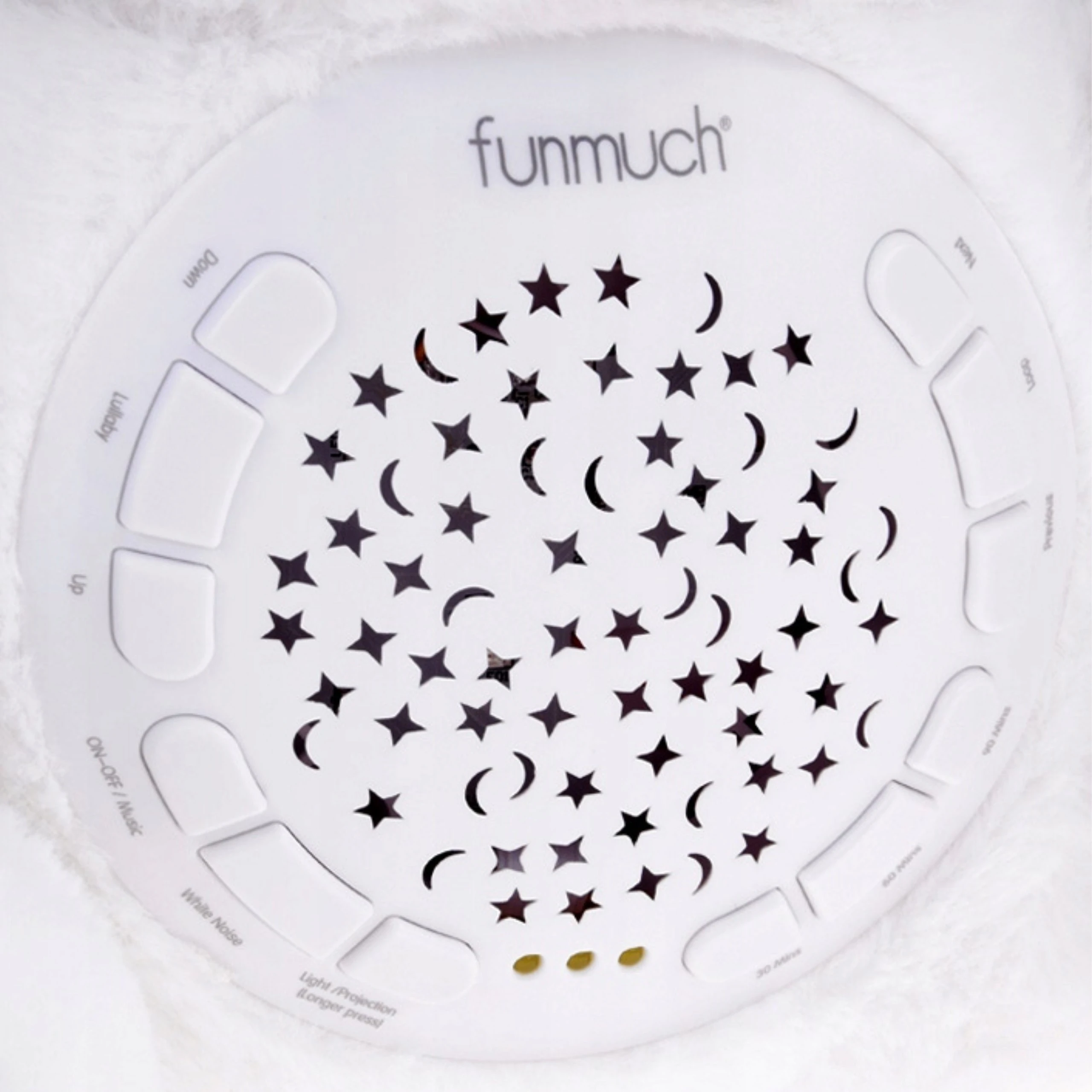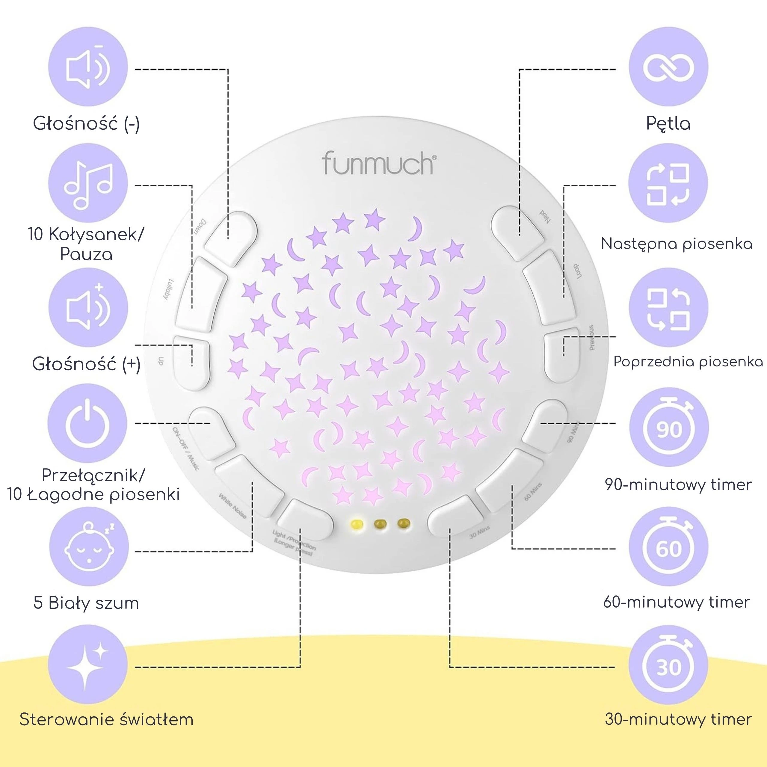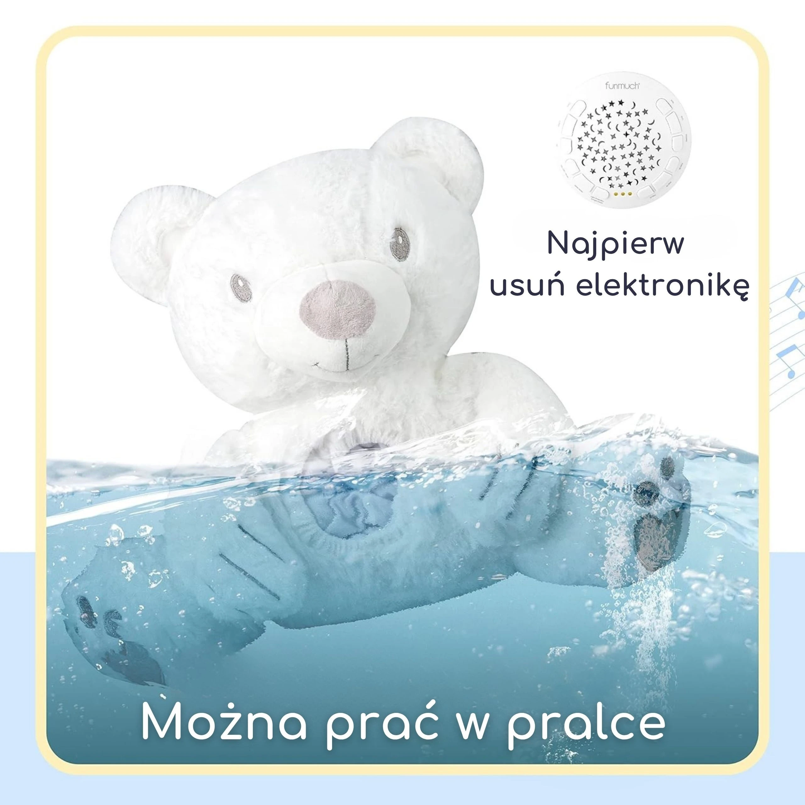Mięciutki Miś Polarny z Projektorem od marki Woopie to idealny towarzysz snu dla każdego maluszka. Ta urocza przytulanka, wykonana z bezpiecznej, bawełnianej tkaniny, łączy w sobie funkcje projektora świetlnego i uspokajacza z muzyką. Miś pomaga ukoić dziecko do snu, emitując na suficie gwieździste niebo z księżycami w 7 różnych efektach świetlnych. Moduł dźwiękowy oferuje bogatą gamę uspokajających dźwięków: 10 delikatnych kołysanek oraz 5 rodzajów białego szumu. Moduł ma wbudowany timer z trzema opcjami czasu (30, 60 lub 90 minut), a także funkcję pętli (Loop) do ciągłego odtwarzania. Dodatkową zaletą jest możliwość prania misia w pralce (po wyjęciu modułu elektronicznego).