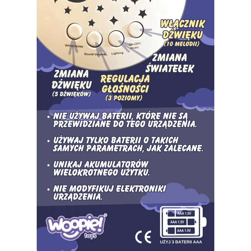 - - efekty świetlne i dźwiękowe - melodie/kołysanki pomagające zasnąć + projektor zmieniający kolory,
