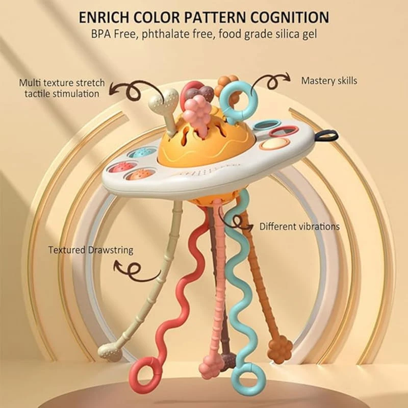 Zabawka Sensoryczna Montessori Gryzak "Przeciąganka" w kształcie UFO od marki WOOPIE to nie tylko doskonała rozrywka, ale i innowacyjny sposób na wspieranie rozwoju Twojego niemowlaka. Zachęca do odkrywania przez zmysły, skupia na rozwoju koordynacji i motoryki oraz łagodzi dyskomfort związany z ząbkowaniem. Zestaw zawiera kolorowe, bezpieczne i łatwe do uchwycenia przez małe rączki sznurki z różnorodnymi teksturami, które pobudzają do działania i eksploracji, jednocześnie oferując ulgę podczas ząbkowania. Pociąganie za sznurek wydaje różnorodne dźwięki i wibracje. Ponadto zabawka jest wyposażona w rząd miękkich przycisków, które zachęcają do dotyku i przyciskania. Podwyższona pozycja pobudza ciekawość dziecka i ćwiczy zręczność małych paluszków Ten sensoryczny gryzak to idealny prezent dla niemowlaka, który łączy rozrywkę z nauką. Dzięki niemu możesz zapewnić Twojemu dziecku zdrowy rozwój i godziny angażującej zabawy. Zapewnij komfort i rozwój swojemu maluchowi!