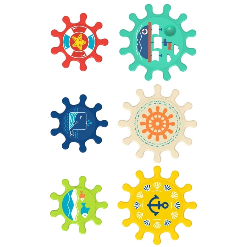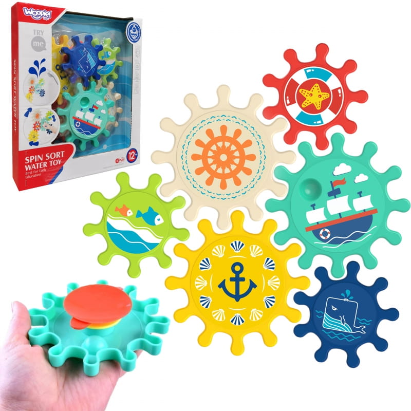 Kolorowe zębatki od marki Woopie to zabawka umilająca dzieciom czas podczas kąpieli. Zestaw składa się z 6 kolorowych trybików w dwóch wielkościach. Przyssawki znajdujące się przy każdym trybiku umożliwiają przymocowanie go do płytek, wanny czy prysznica, w taki sposób aby elementy zazębiały się. Dziecko podczas zabawy ruszając jeden element wprawia w ruch całą zbudowaną przez siebie konstrukcję. Maluch bawiąc się poznaje zasadę przyczynowo - skutkową, rozwinie zmysły a kolorowa morska grafika zachęci do zabawy i urozmaici zabawę pod prysznicem lub w wannie.
