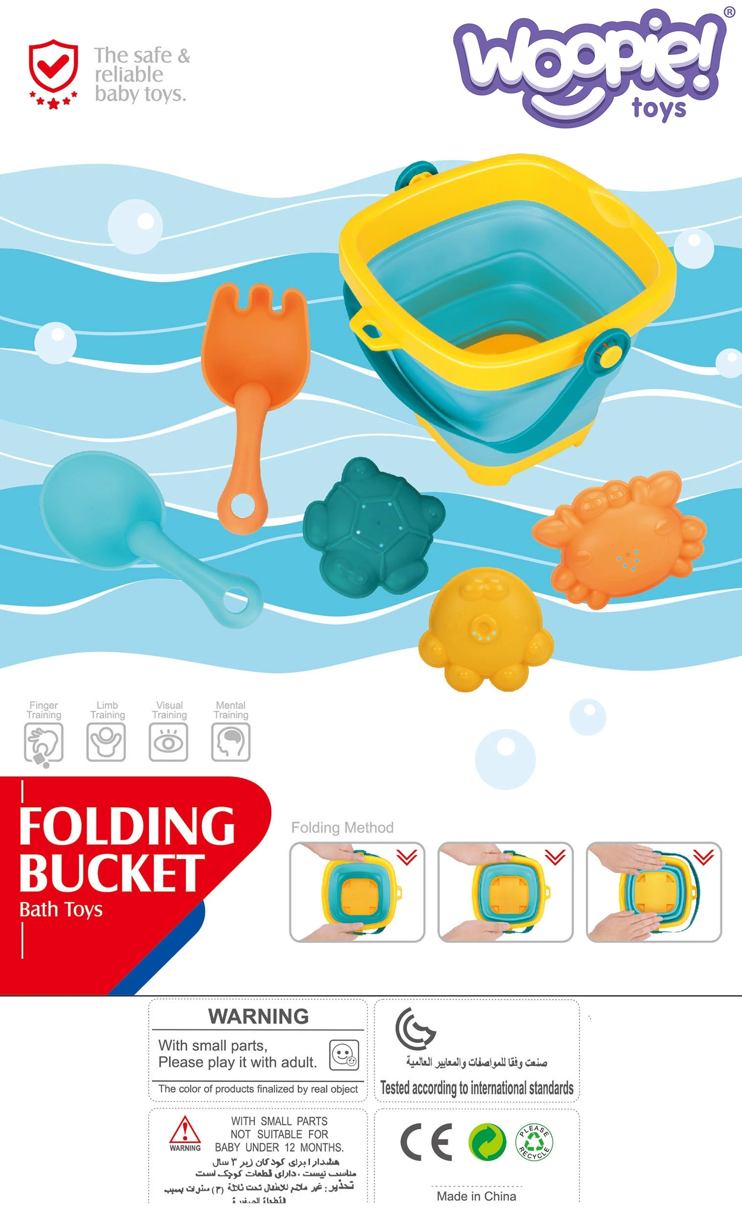 Silikonowe wiaderko z grabkami, łopatką i foremkami od marki WOOPIE. Fantastyczne wiaderko do piaskownicy, na plażę lub do ogrodu, dzięki któremu dzieci miło spędzą czas na świeżym powietrzu. Wiaderko, dzięki składanej konstrukcji, zajmuje niewiele miejsca, jest łatwe w transporcie i wygodne do przechowywania. W zestawie dołączone są trzy foremki do piasku. Zestaw zmieści się do dziecięcego plecaczka, do wózka czy plażowej torby. Góra, spód i rączka wiaderka są plastikowe, a ścianki wykonane są z grubego silikonu składanego harmonijkowo. Plastikowe są również grabki i łopatka.