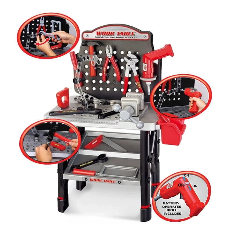 Bogato wyposażony Stół Warsztatowy marki WOOPIE jest idealny dla każdego małego mechanika! Pozwala od małego uczyć się jak używać narzędzi budowlanych oraz zasad ich działania. Warsztat zapewni dziecku doskonałą zabawę, ucząc jednocześnie samodzielności i porządku. Solidne wykonanie i materiały bezpieczne dla dziecka. Zabawka rozwija kreatywność i pobudza wyobraźnię malucha oraz kształtuje jego zdolności motoryczne. W zestawie znajdują się niezbędne każdemu małemu majsterkowiczowi narzędzia – między innymi wiertarkę na baterie, młotek, piłę, imadło, śrubokręt, śrubki oraz inne elementy. W skład zestawu wchodzi aż 50 elementów!
