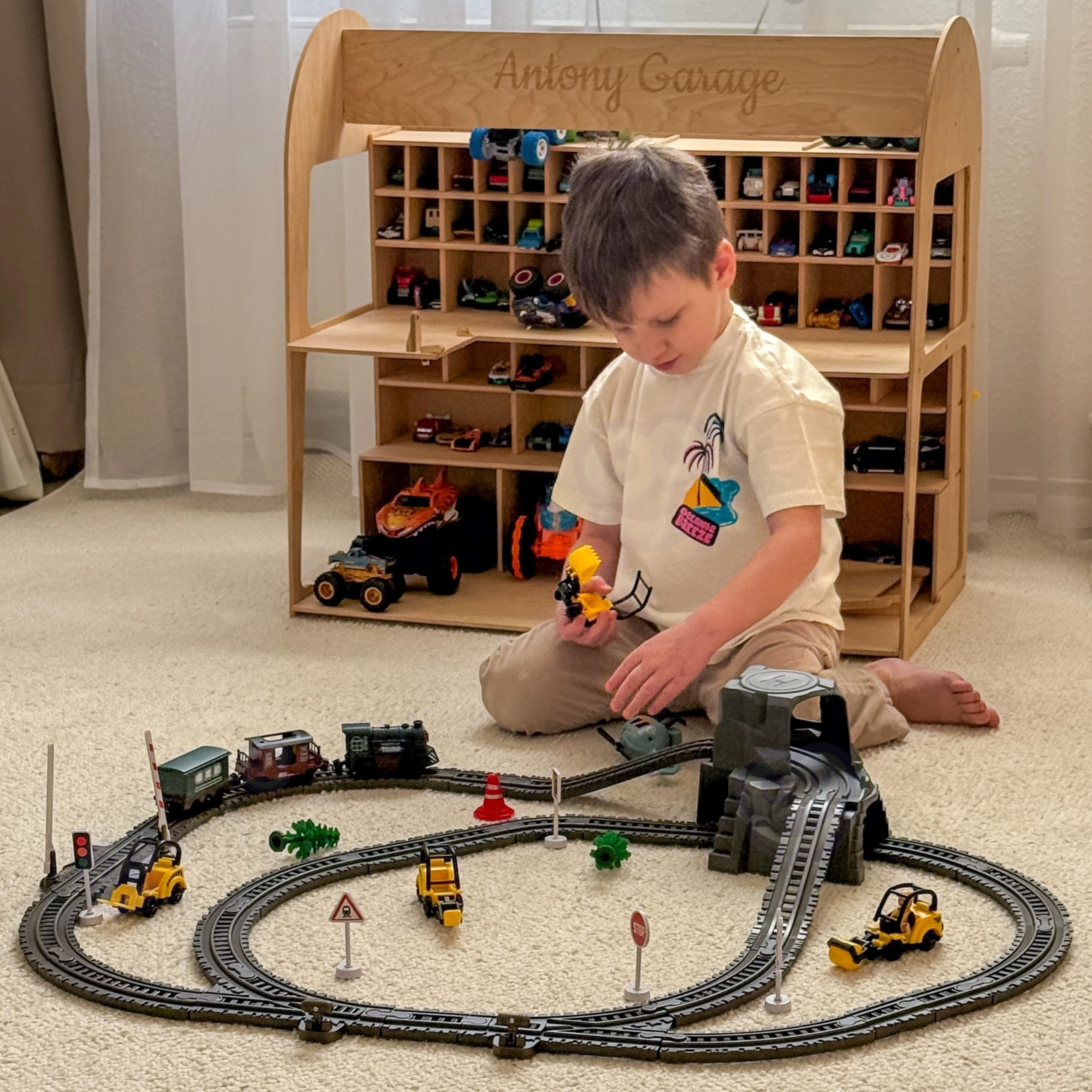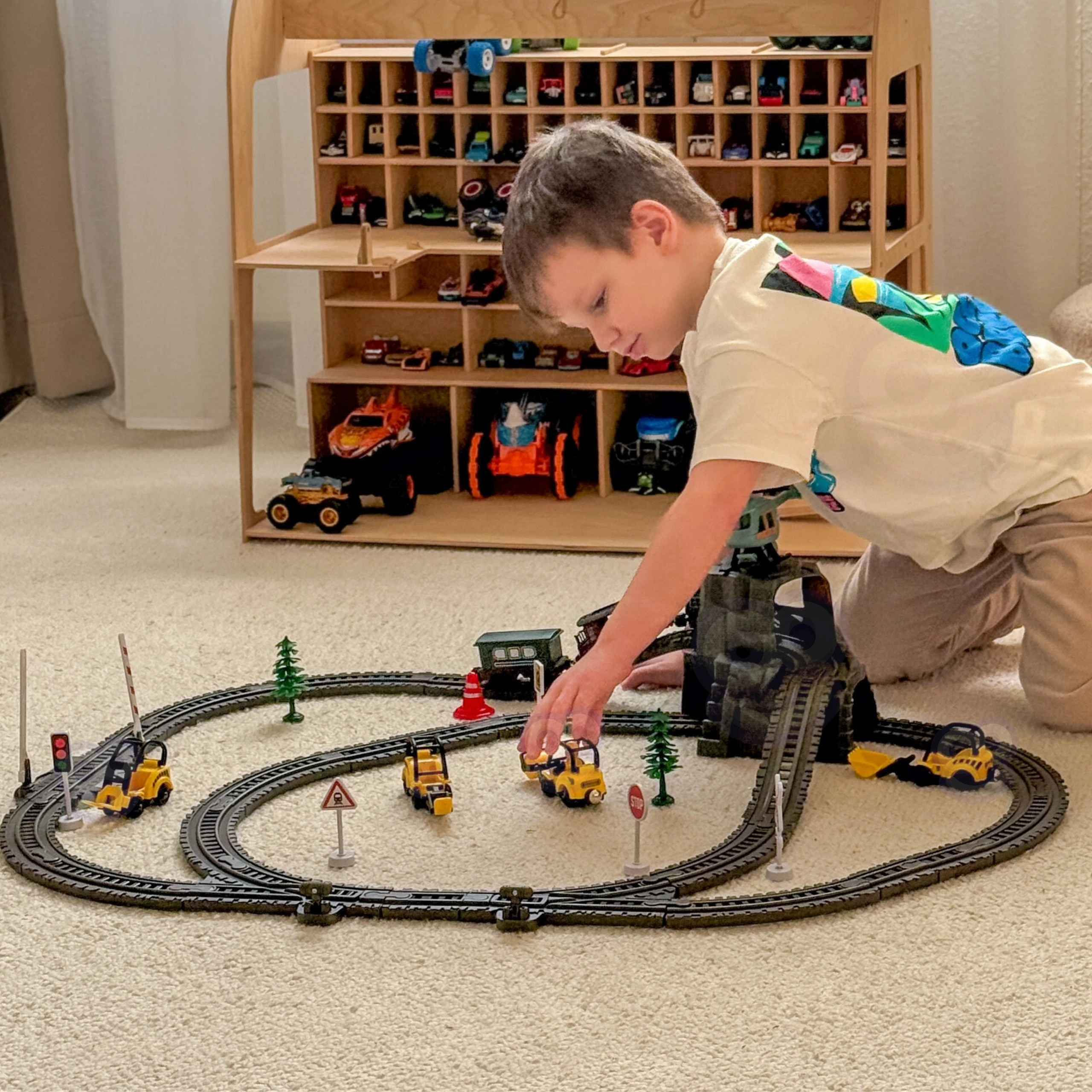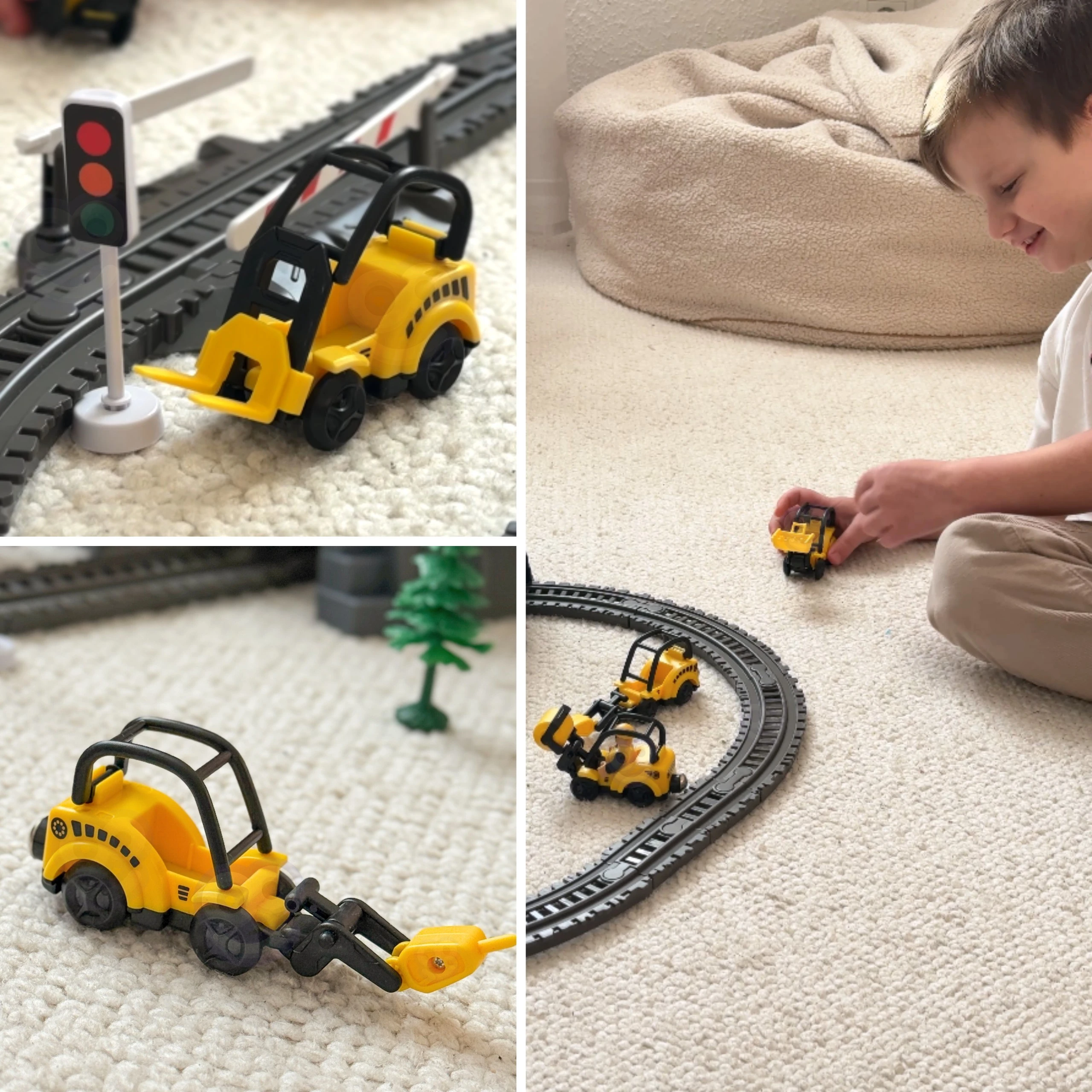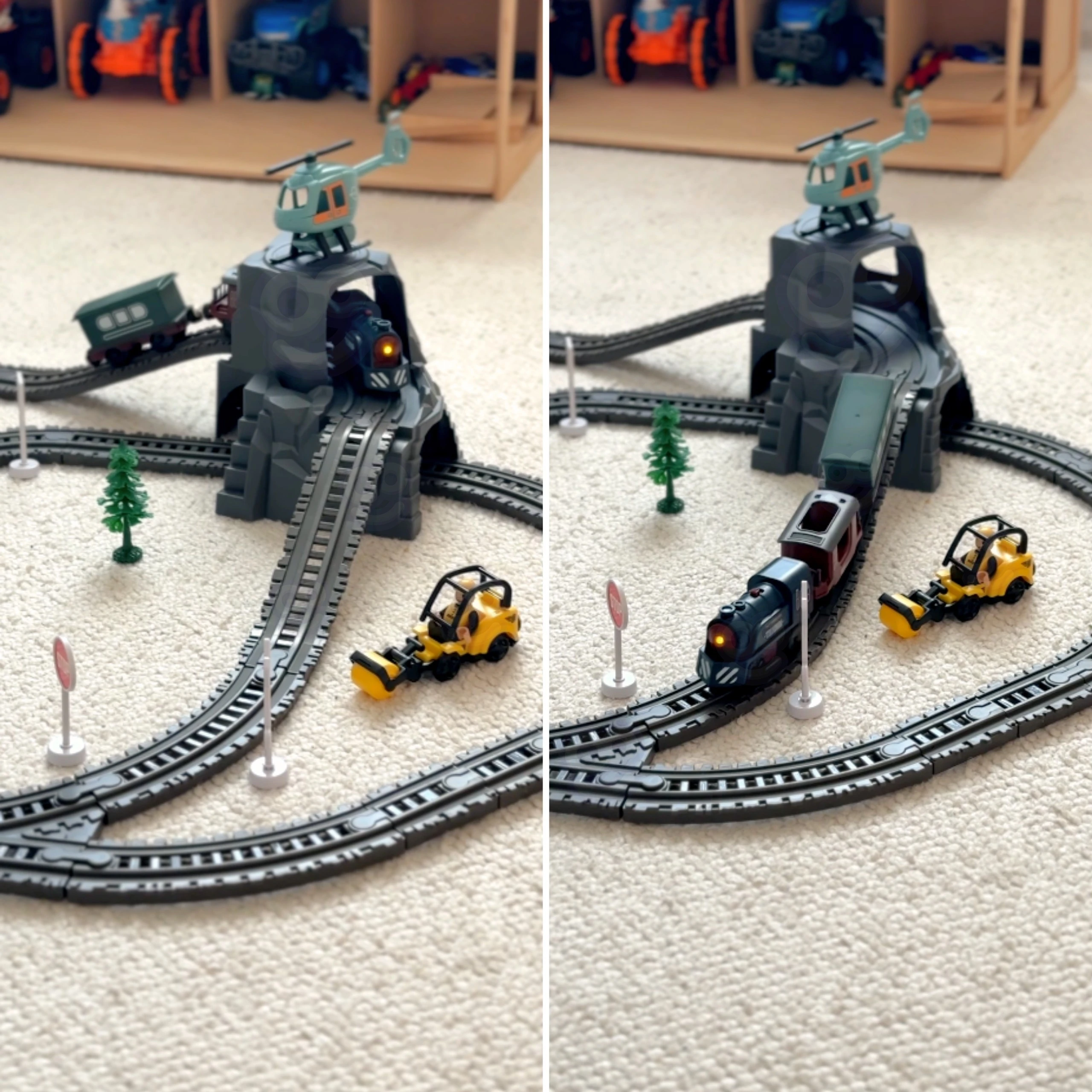 Kolejka porusza się po torach automatycznie – wystarczy włączyć silnik, by pociąg ruszył w podróż po całej trasie!