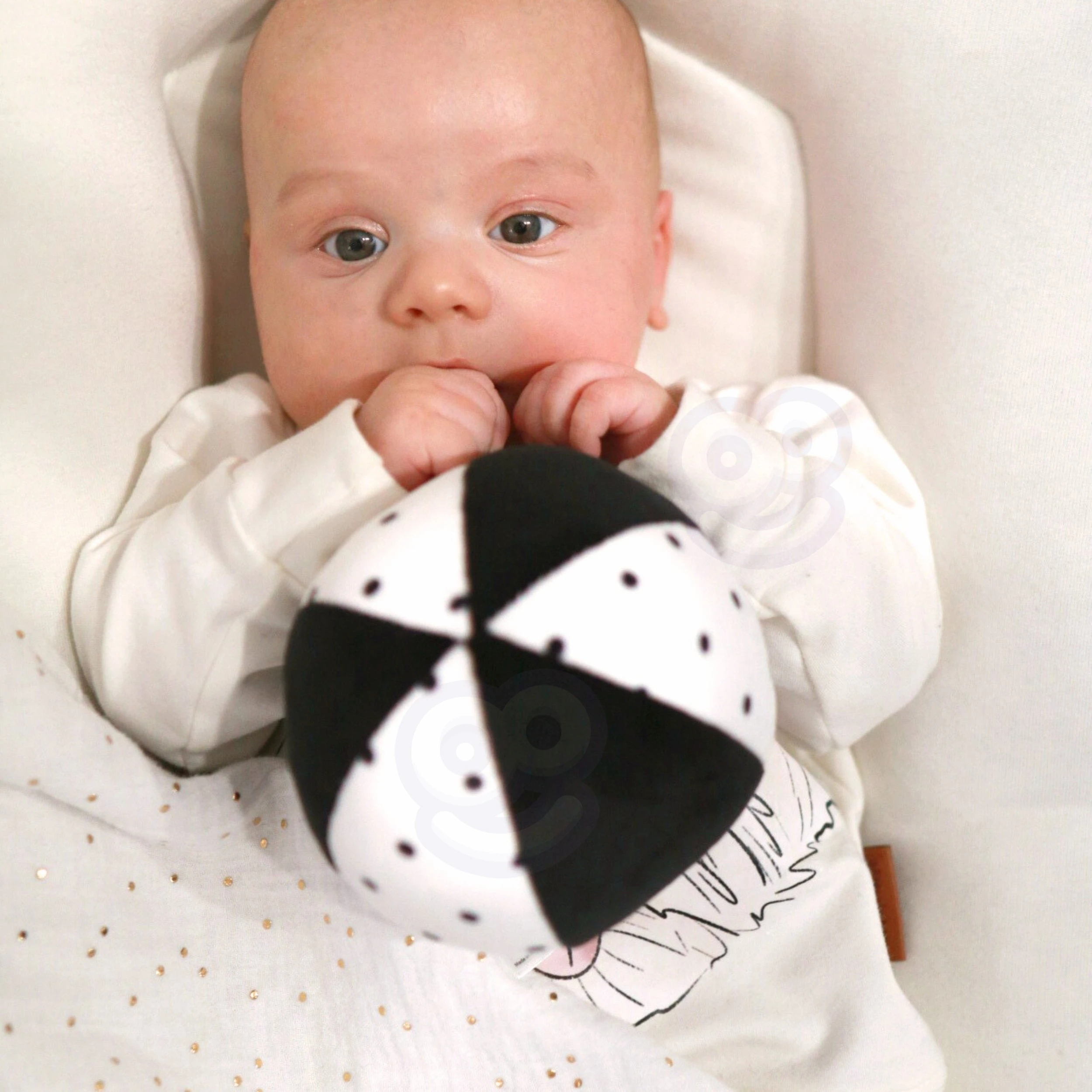 - - Pluszową piłkę kontrastową – ćwiczy chwytanie, wzrok i motorykę podczas leżenia na brzuszku.