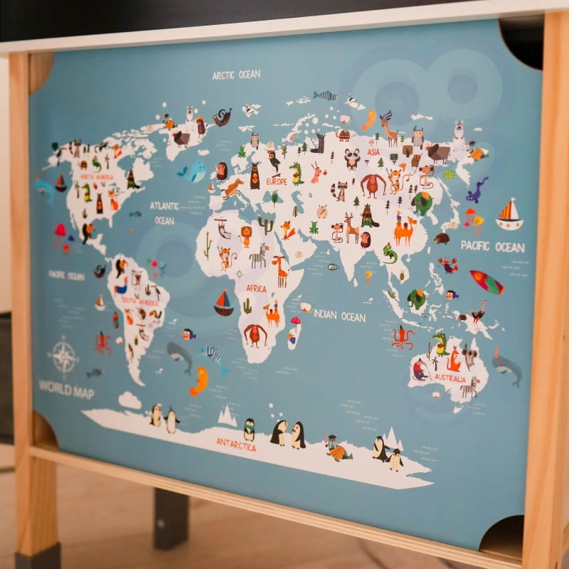 - - Tył zestawu kryje tablicę kredową oraz kolorową mapę świata, które inspirują do rysowania, nauki oraz poznawania kontynentów i kultur