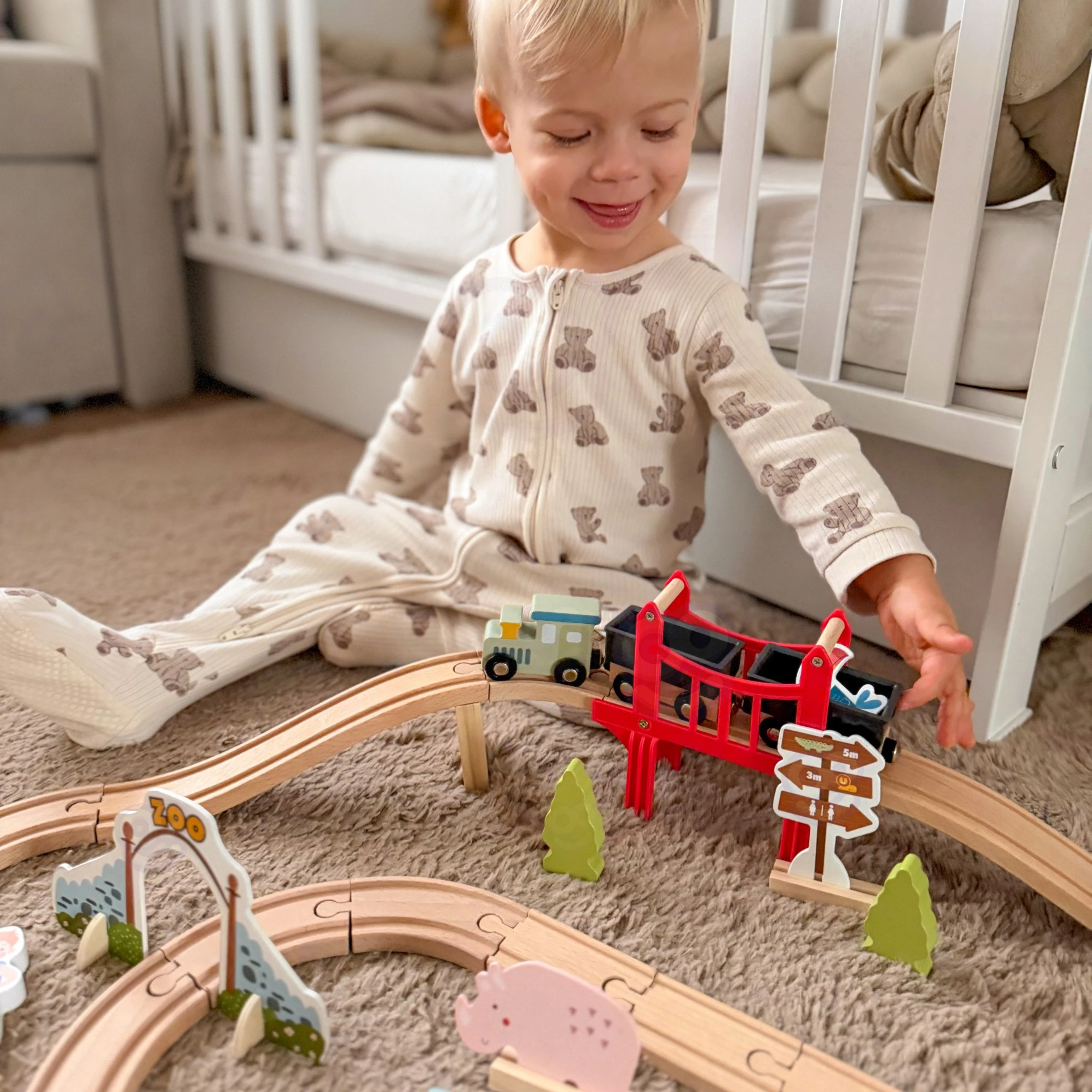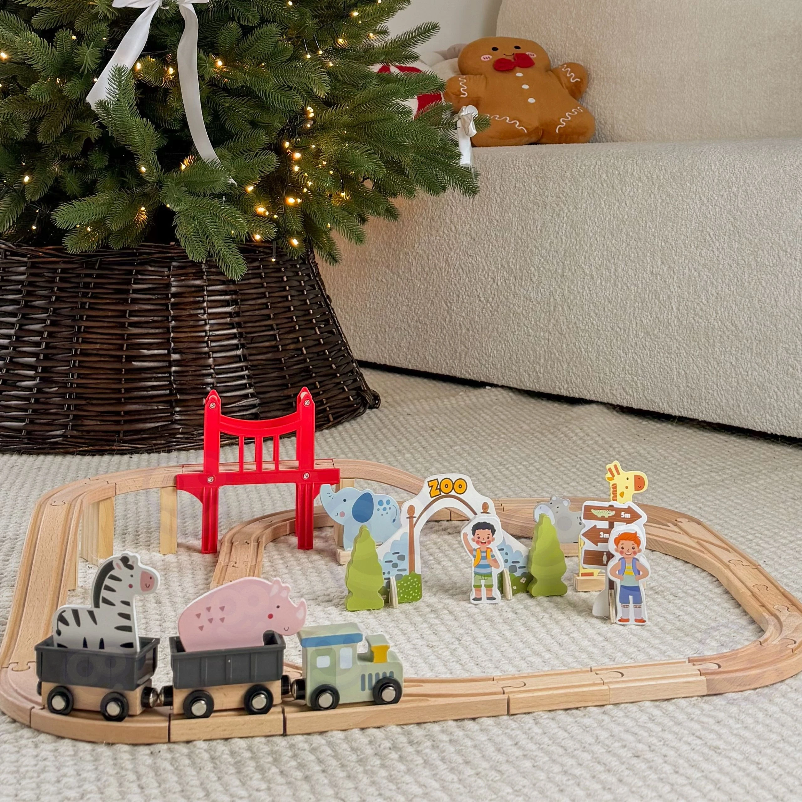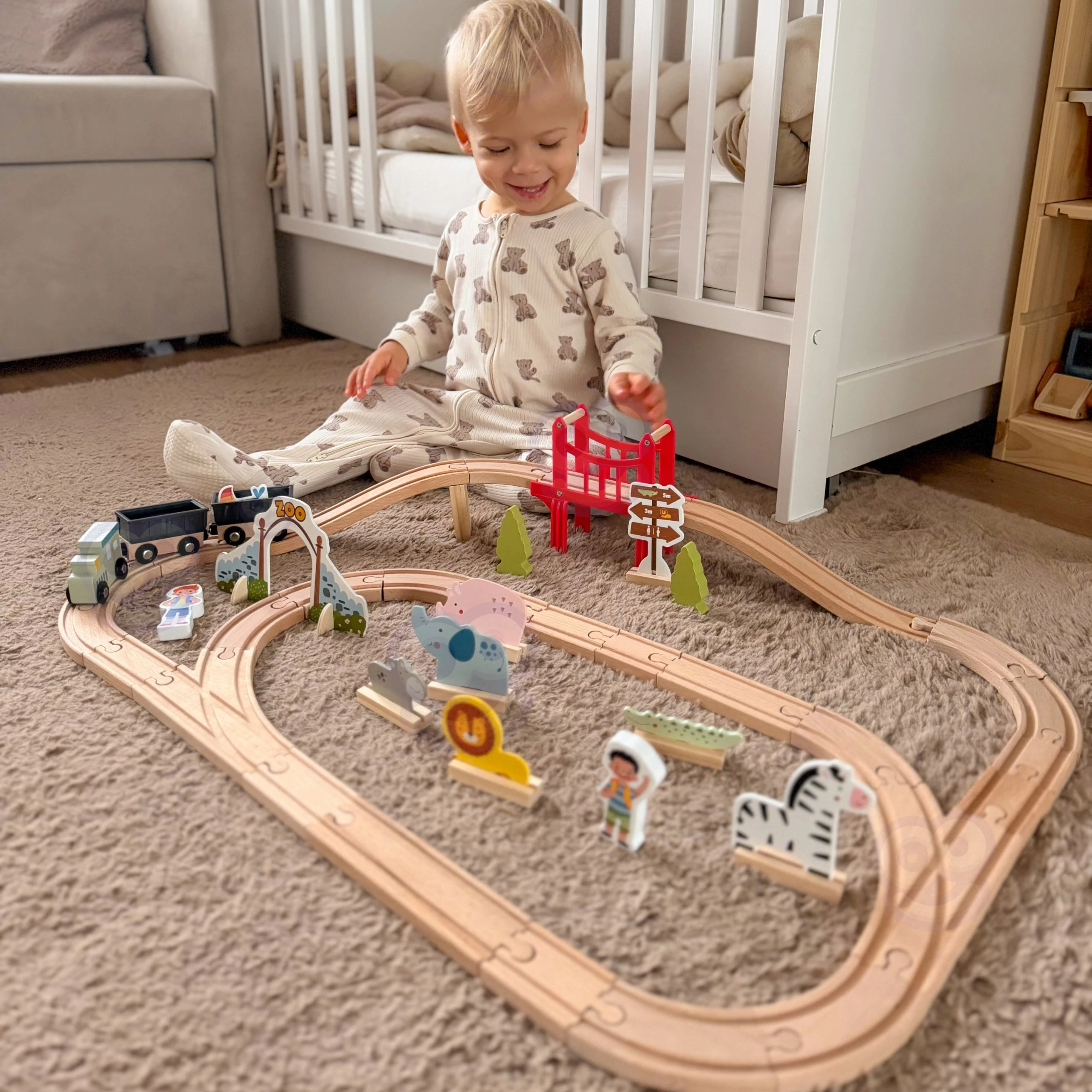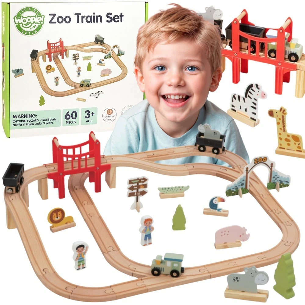 Zapraszamy w fascynującą podróż przez zoo pełne uroczych mieszkańców! Ten drewniany zestaw kolejowy marki Woopie Green to znacznie więcej niż zwykła zabawka – to przepustka do świata wyobraźni, gdzie każda przejażdżka pociągiem staje się niepowtarzalną przygodą. Solidnie wykonane tory łączą się w różnorodne konfiguracje, a czerwona brama do zoo oraz most wznoszą zabawę na wyższy poziom. Pociąg z wagonami połączonymi magnesami przemierza drewniany tor, odwiedzając żyrafę, słonia, lwa, zebry i inne zwierzęta. Dziecko samodzielnie buduje tor, aranżuje scenerie i tworzy własne historie – to czysta radość z twórczej zabawy, która angażuje na długie godziny.