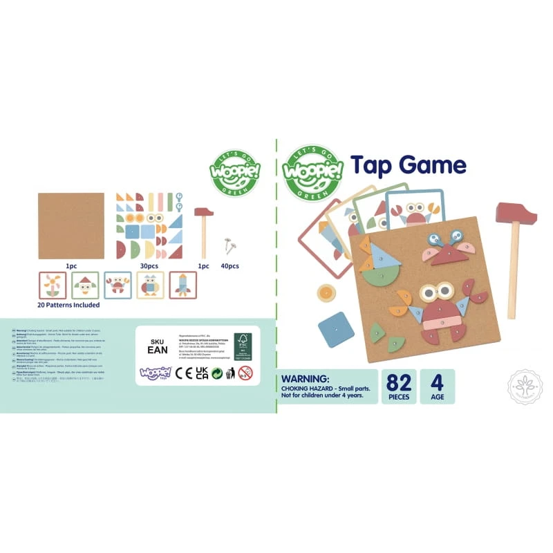 Przybijanka korkowa od marki WOOPIE z serii GREEN to idealna zabawka edukacyjna dla małego konstruktora. Zestaw zawiera 82 elementy, w tym: 30 klocków, 10 dwustronnych kart z 20 wzorami (3 poziomy trudności) do ułożenia i przybicia, 40 pinezek, tablice i młoteczek. W tej zabawie dzieci starają się odtworzyć obraz/układ z karty za pomocą przybijania odpowiednich klocków o różnym kształcie i kolorze np. obraz ptaka lub kwiatka. Każdy drewniany element posiada otwór i dziecko za pomocą pinesek bez problemu może wbić dowolny kształt do tablicy. Zabawę można urozmaicić o grę w zapamiętywanie i odtwarzanie z pamięci obrazka przez malucha. Dziecko może również wymyślić swój własny kształt/kontr - ogranicza tylko kreatywność i wyobraźnia. Zabawka rozwija zdolności manualne, logiczne myślenie, wyobraźnie i kreatywność, koncentracje oraz zapamiętywanie.