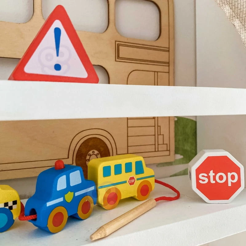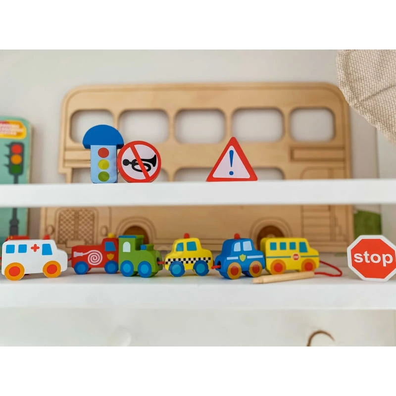 - - zestaw składa się ze sznureczka oraz 12 klocków przedstawiających różne pojazdy, m.in.: straż pożarną, karetkę, traktor, samochody osobowe oraz znaki drogowe