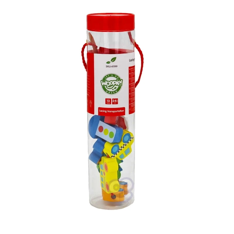 Klocki Koraliki Do Nawlekania Pojazdy Samochody od marki WOOPIE z serii GREEN to idealna zabawka do rozwijania umiejętności manualnych dziecka. Przeplatanka dla dzieci utrzymana została w motywie pojazdów. Nawlekanka to klasyczny zestaw drewnianych klocków z dziurkami, przez które dziecko przeplata sznureczek. Jest to świetna zabawa, która pobudza obszary w mózgu i rozwija zdolności manualne tzw. "małą motorykę", koordynację ręka-oko, wspomaga koncentrację oraz wzbudza ciekawość dziecka na temat pojazdów i znaków drogowych!