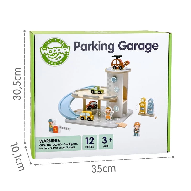 Wielopoziomowy drewniany parking marki Woopie Green to marzenie każdego małego miłośnika samochodów. Ta wyjątkowa zabawka oferuje mnóstwo możliwości kreatywnej zabawy. Kolorowe drewniane samochody zjeżdżają po niebieskiej zjeżdżalni, helikopter z obrotowym śmigłem ląduje na szczycie wieży, a figurki pracowników dbają o porządek i obsługują stację benzynową. Solidna drewniana konstrukcja w subtelnych, pastelowych kolorach świetnie wygląda w pokoju dziecka