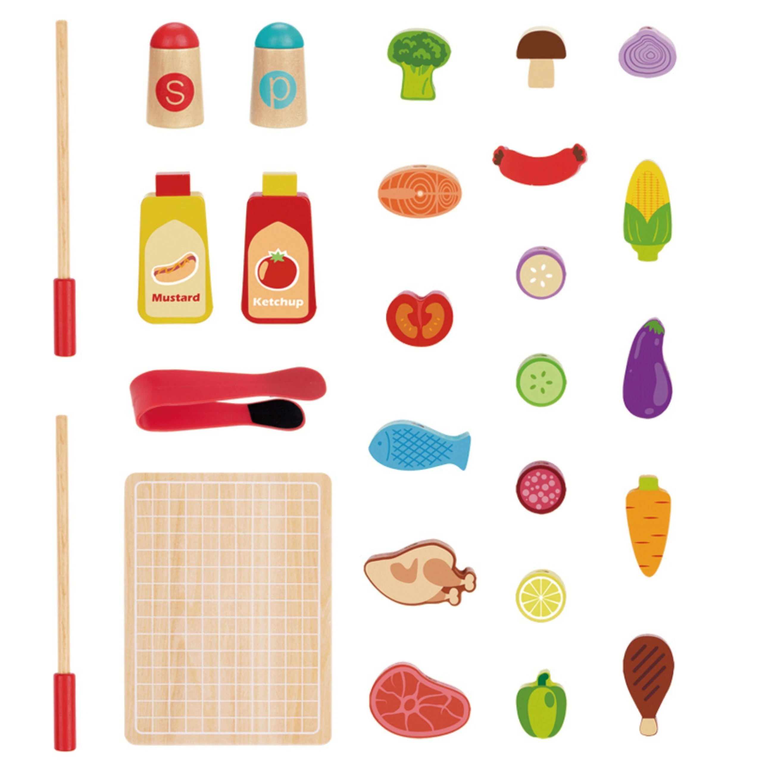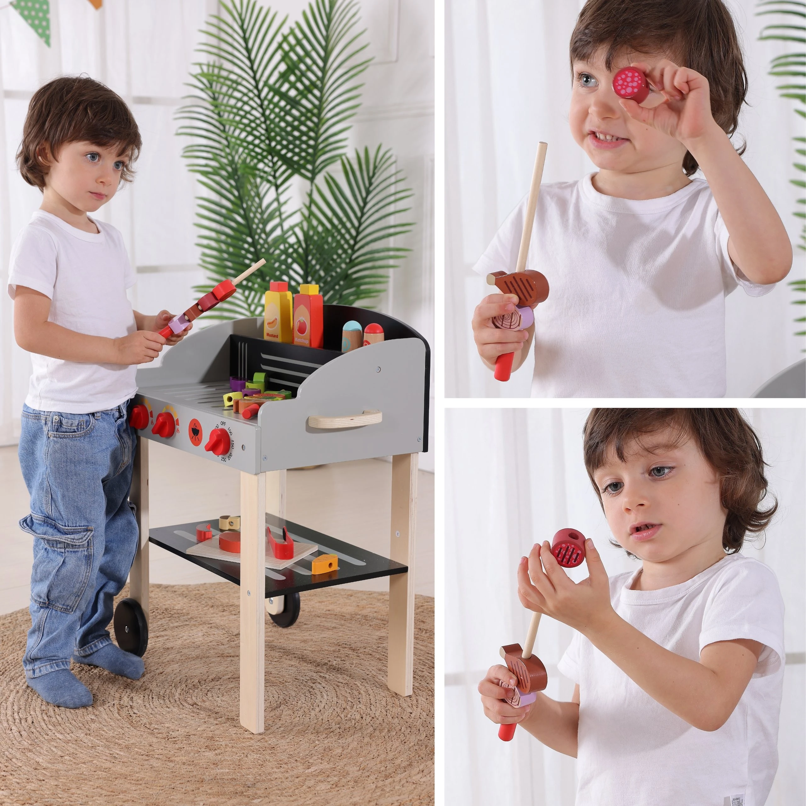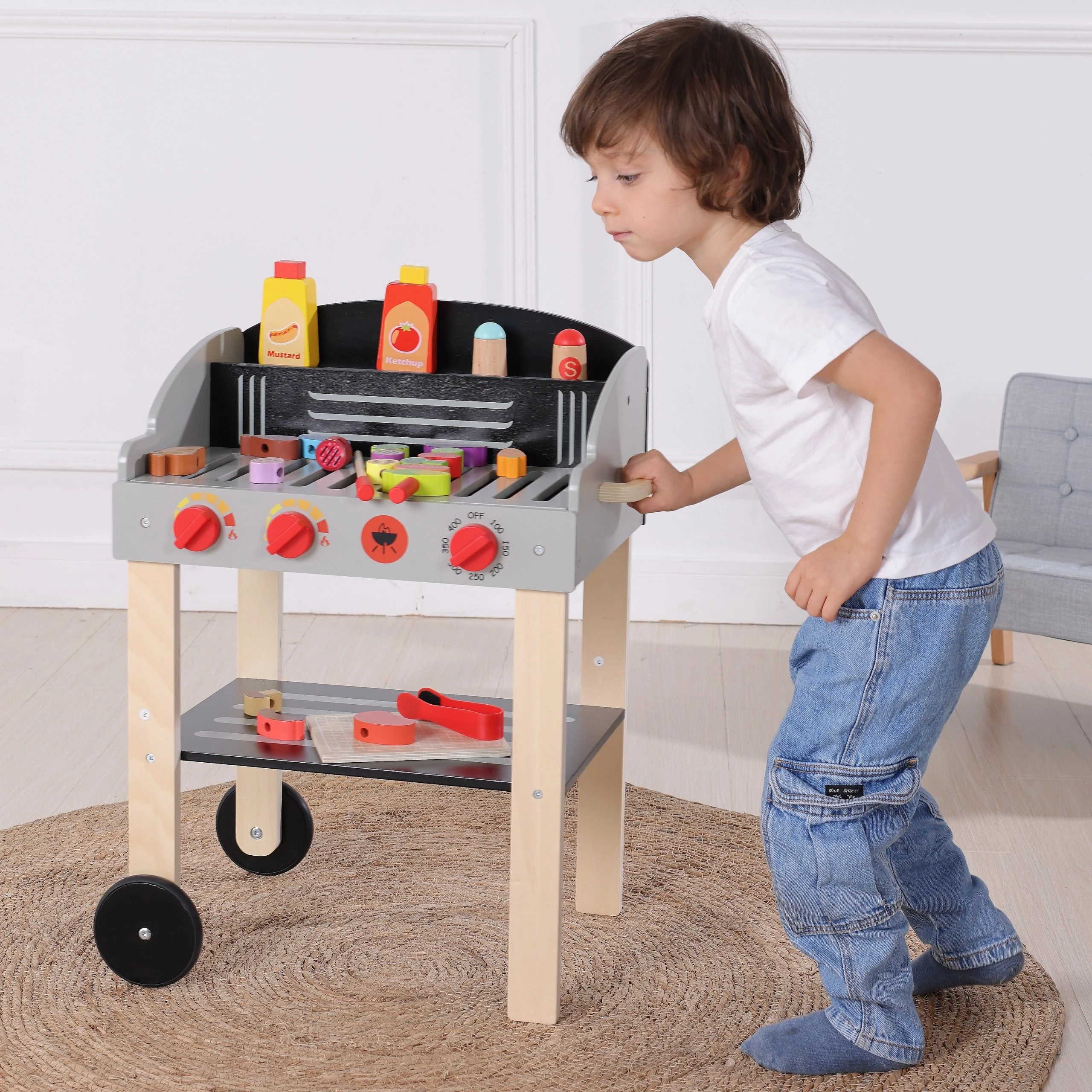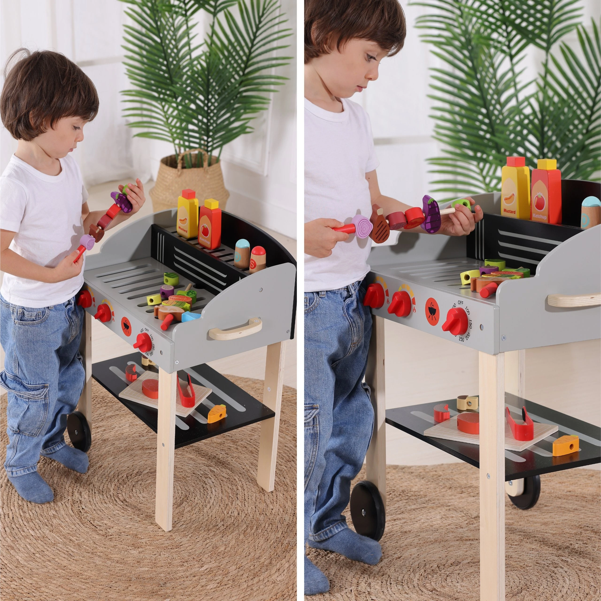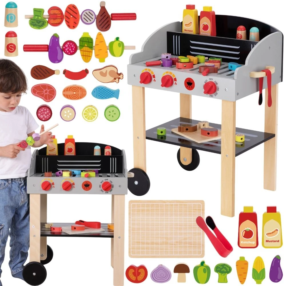 Drewniany Grill Ogrodowy od marki Woopie to wspaniała propozycja dla małych kucharzy, którzy uwielbiają naśladować dorosłych. Ten mobilny zestaw na kółkach pozwala na zabawę w grillowanie zarówno w domu, jak i w ogrodzie. Wykonany z wysokiej jakości drewna, pomalowany bezpiecznymi dla dzieci farbami, zachwyca żywą kolorystyką i dbałością o detale. Grill posiada otwieraną pokrywę, wygodną półkę na akcesoria oraz pokrętła, które imitują działanie prawdziwego urządzenia. W zestawie znajdują się liczne akcesoria kuchenne, takie jak szaszłyki, produkty spożywcze, sosy i szczypce, co gwarantuje wielogodzinną, kreatywną zabawę. To idealna zabawka do nauki przyrządzania posiłków i rozwijania pasji kulinarnych.