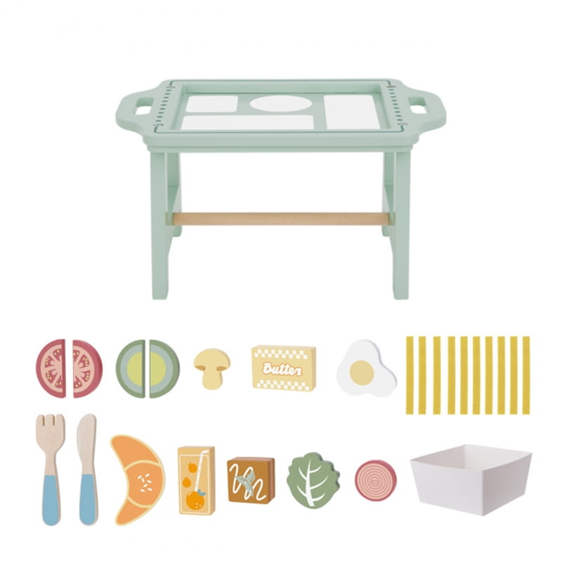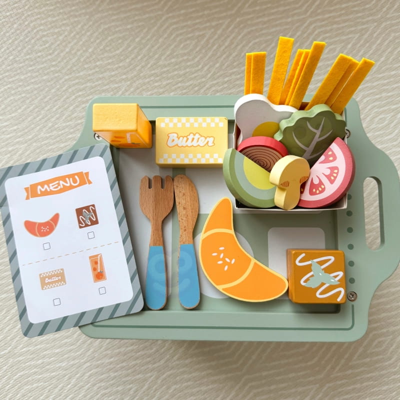Urocza pastelowa taca i realistycznie wykonane drewniane elementy sprawiają, że zabawa staje się wyjątkowo angażująca i inspirująca