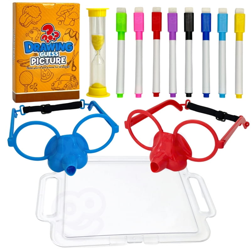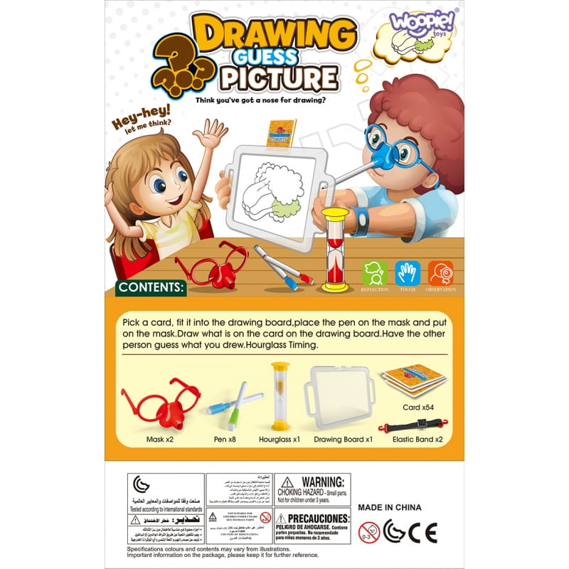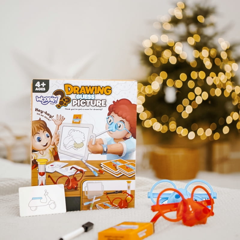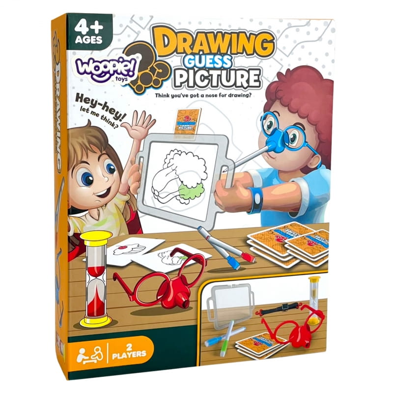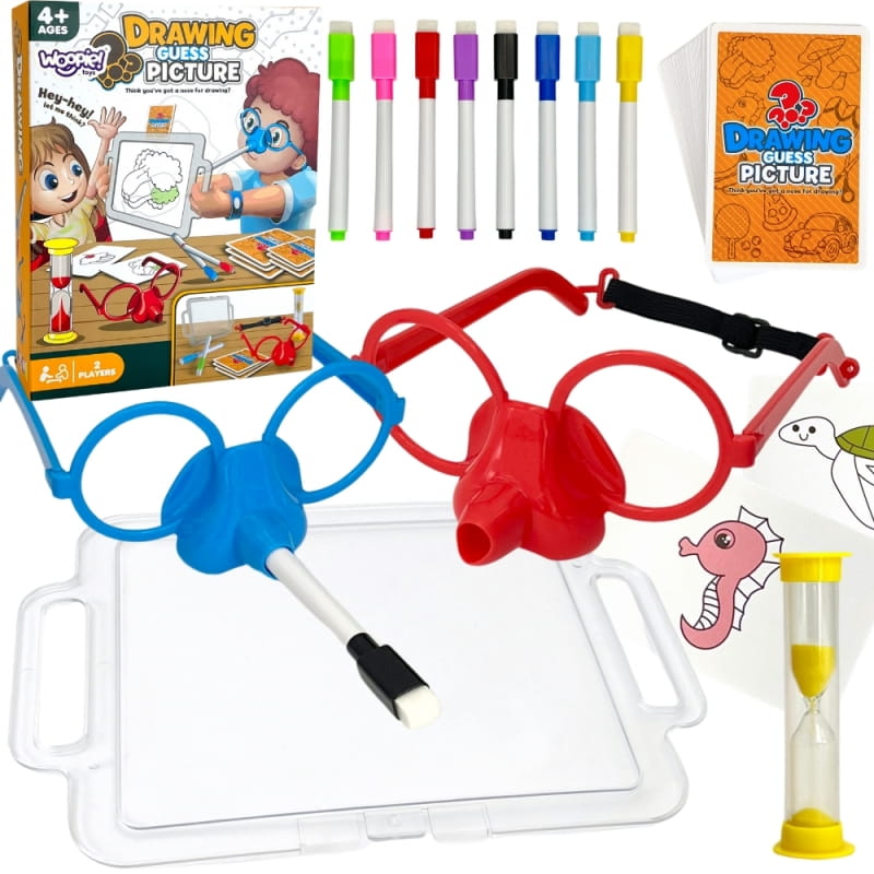 Czy wyobrażałeś sobie kiedyś, że rysujesz wyłącznie nosem? Dzięki wspaniałej grze "Narysuj i Zgadnij Obrazek" od marki WOOPIE będzie to możliwe, ponieważ to będzie twoje zadanie! Załóż specjalne okulary z markerem, i namaluj na tablicy przed sobą wylosowany obrazek – to jedyny sposób, aby Twoja drużyna odgadła wylosowane hasła. Czasu jest niewiele, więc śpiesz się, bo klepsydra już tyka!