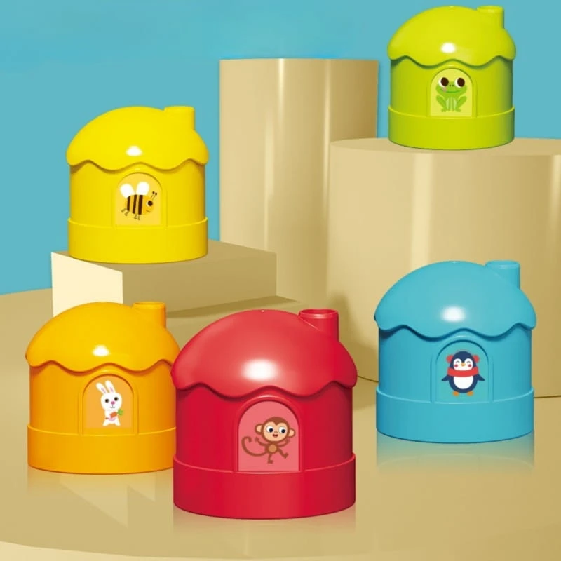 - - W zestawie 5 kolorowych pojemników/domków z uroczymi naklejkami zwierząt