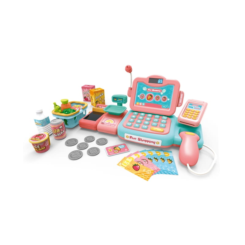 Kasa Sklepowa z wieloma dodatkami od Woopie to idealny pomysł dla dzieci powyżej 3 roku życia. Zabawka rozwija wyobraźnię dzieci i zachęca je do kreatywnego myślenia. Dzieci mogą ważyć owoce i warzywa, a następnie nabić je za pomocą klawiatury na kasę. Przy pomocy czytnika dzieci zeskanują paczkę ciasteczek lub butelkę wody. Następnie będą mogły zapłacić na dwa sposoby: tradycyjnie za pomocą pieniędzy lub za pomocą karty płatniczej. Wszystko to jest dołączone do zestawu i zapewni dziecku długie godziny zabawy.