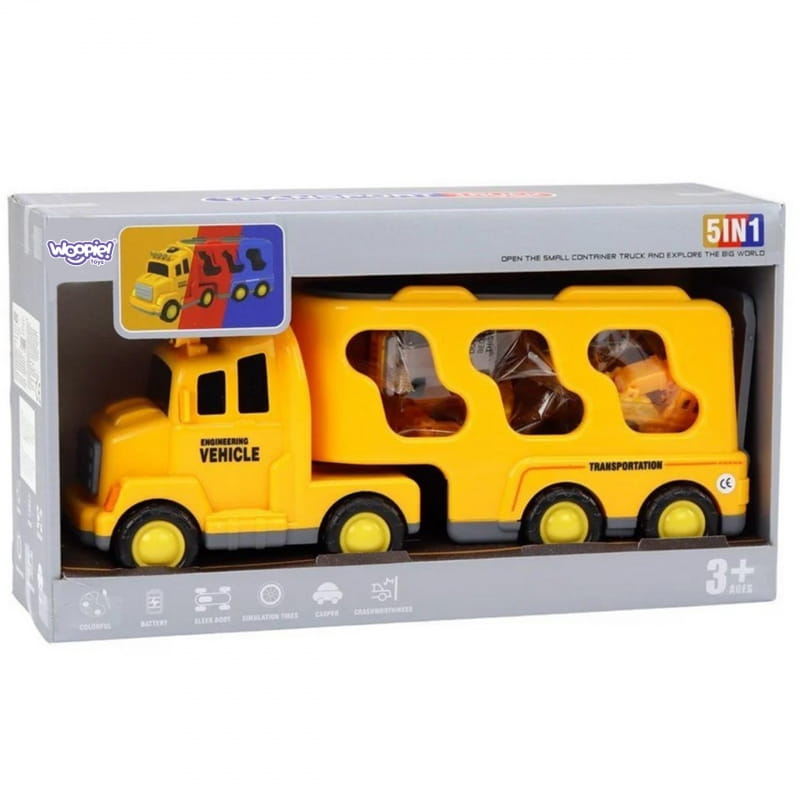 Zestaw Aut " Pomoc Drogowa" od marki WOOPIE to zabawka, która zachwyci małych miłośników motoryzacji i pojazdów budowlanych. Zapewni wiele godzin fascynującej zabawy, która pobudzi wyobraźnię twojego dziecka. Zestaw zawiera 5 aut: dużą lawetę, która po skończonej zabawie może pełnić funkcję przechowywania dla mniejszych aut, koparkę, betoniarkę, dźwig, buldożer. Napęd frykcyjny w mniejszych autach budowlanych umożliwia dzieciom samodzielne poruszanie się nimi, co urozmaica zabawę i dodaje jeszcze ciekawsze funkcje do zabawy!