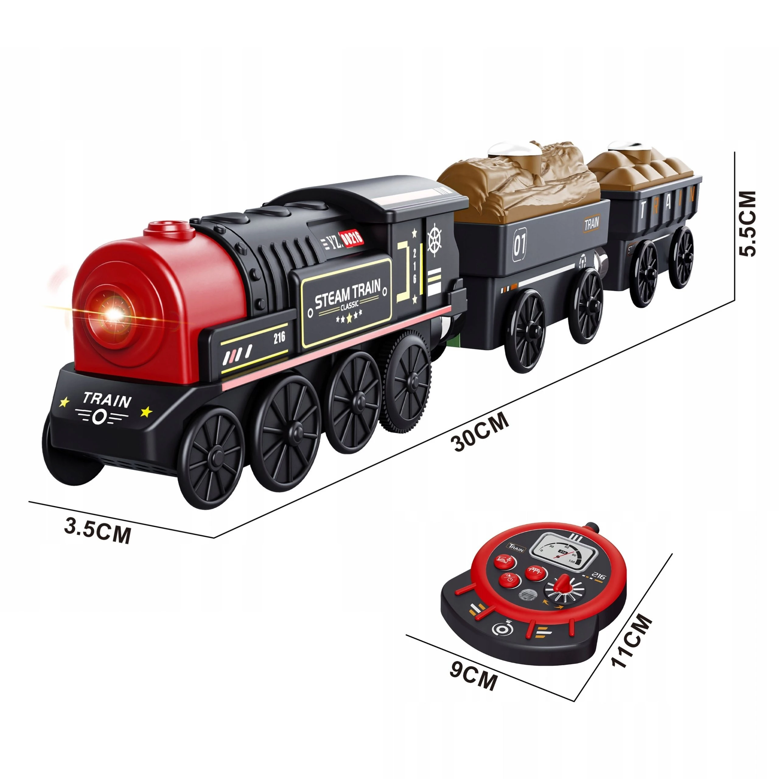 - - lokomotywa posiada 3 przyciski, za pomocą których można sterować nią nawet bez pilota : środkowy przycisk po dłuższym utrzymaniu włącza lokomotywę, dodatkowe 2 zadają kierunek jazdy