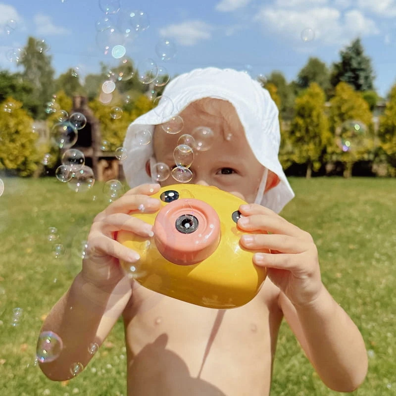 Maszyna do robienia baniek w kształcie kurczaczka marki Woopie to świetna zabawka dla dzieci. Kurczaczek podczas puszczania baniek gra przyjemną dla ucha melodyjkę, która dodatkowo umila zabawę. Wypuszczone bąbelki wystrzeliwane są nie tylko z dużą częstotliwością, ale dodatkowo zainstalowany wiatraczek wydmuchuje je jeszcze dalej. Znajdziemy również pojemniczek na płyn na bańki oraz smycz, aby zawiesić zabawkę na szyi.