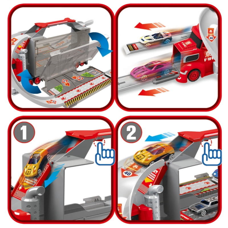 Zestaw Six-Six-Zero to wielofunkcyjna zabawka, która w jednej chwili może pełnić rolę klasycznej ciężarówki transportowej, a po rozłożeniu zamienia się w rozbudowany tor wyścigowy z katapultą. Główna część zestawu to duża, efektowna ciężarówka stylizowana na pojazd strażacki, która pełni funkcję zarówno pojazdu transportowego, jak i przenośnej walizki na samochodziki i akcesoria. Po otwarciu naczepy i rozłożeniu elementów, użytkownik zyskuje dostęp do garażu oraz toru wyścigowego, na którym można organizować emocjonujące wyścigi i pojedynki samochodowe.