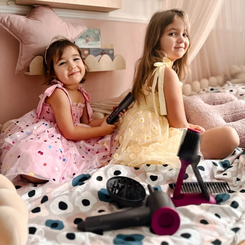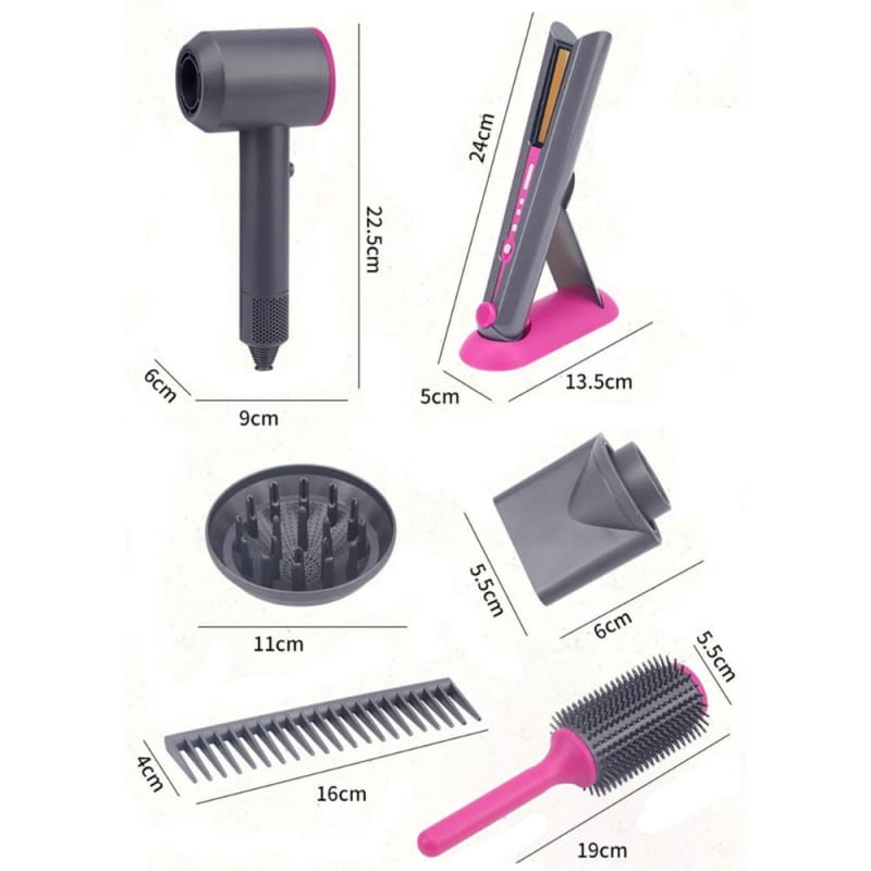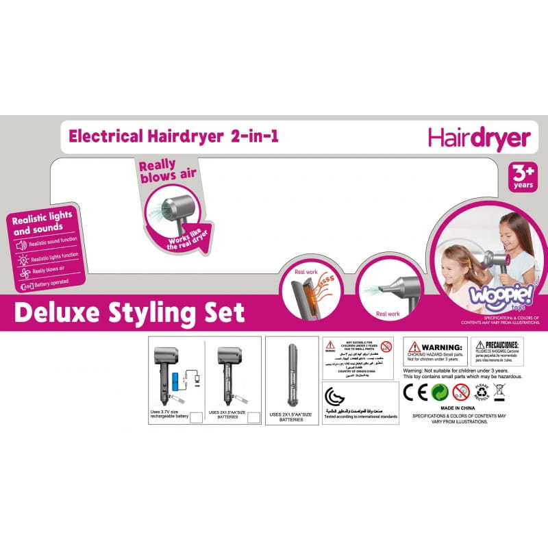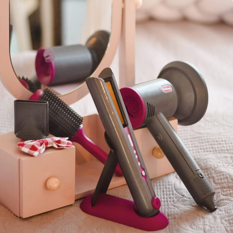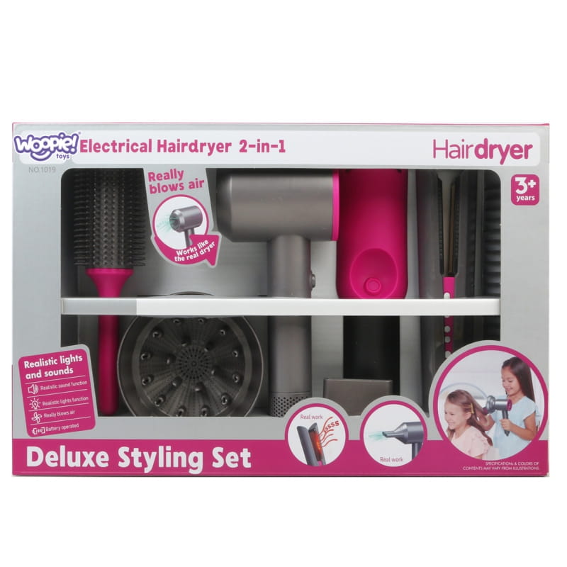 - - w zestawie: zabawkowa suszarka do włosów, nasadki, szczotka, grzebień do rozczesywania, itp.