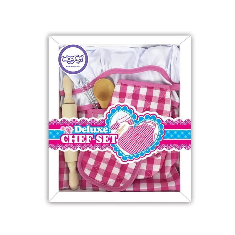 WOOPIE Zestaw Kucharza Strój Kucharski z Akcesoriami to idealny produkt dla każdego małego szefa kuchni. Ślicznie zapakowany świetnie sprawdzi się jako prezent dla małego kucharza. W skład zestawu wchodzi: fartuszek, czapka, rękawica kuchenna, podkładka materiałowa, wałek do ciasta o długości około 20 cm, drewniana łyżka oraz metalowa ubijaczka. Każdy maluch lubi pomagać w pracach kuchennych, dzięki temu zestawowi zostanie idealnie wyposażony w niezbędne akcesoria!
