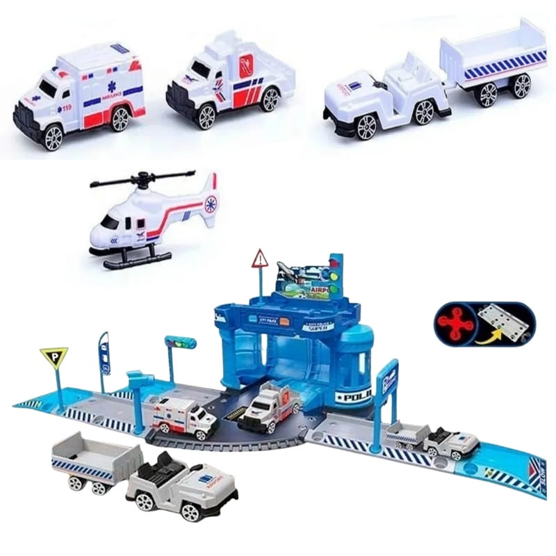 - - W zestawie różnorodne pojazdy: auto policyjne, helikopter, samochody lotniskowe.