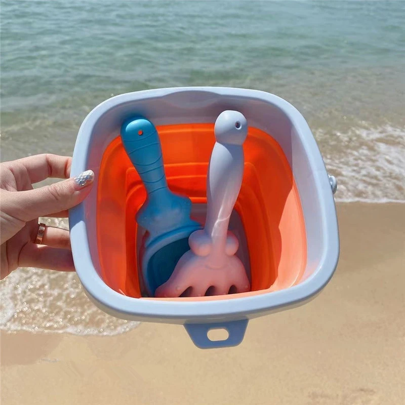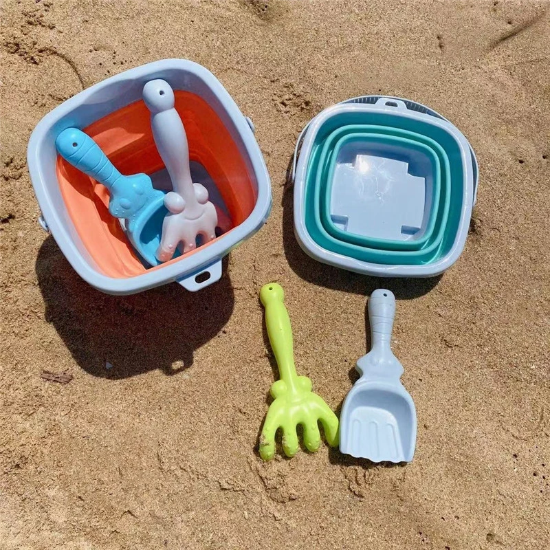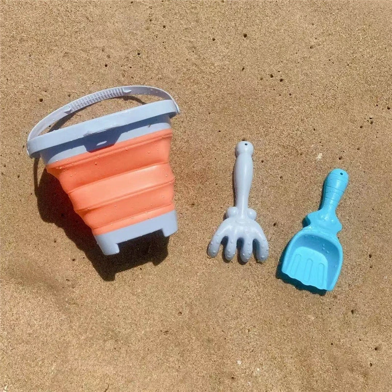 Góra, spód i rączka wiaderka są plastikowe, a ścianki wykonane są z grubego silikonu składanego harmonijkowo. Plastikowe są również grabki i łopatka.