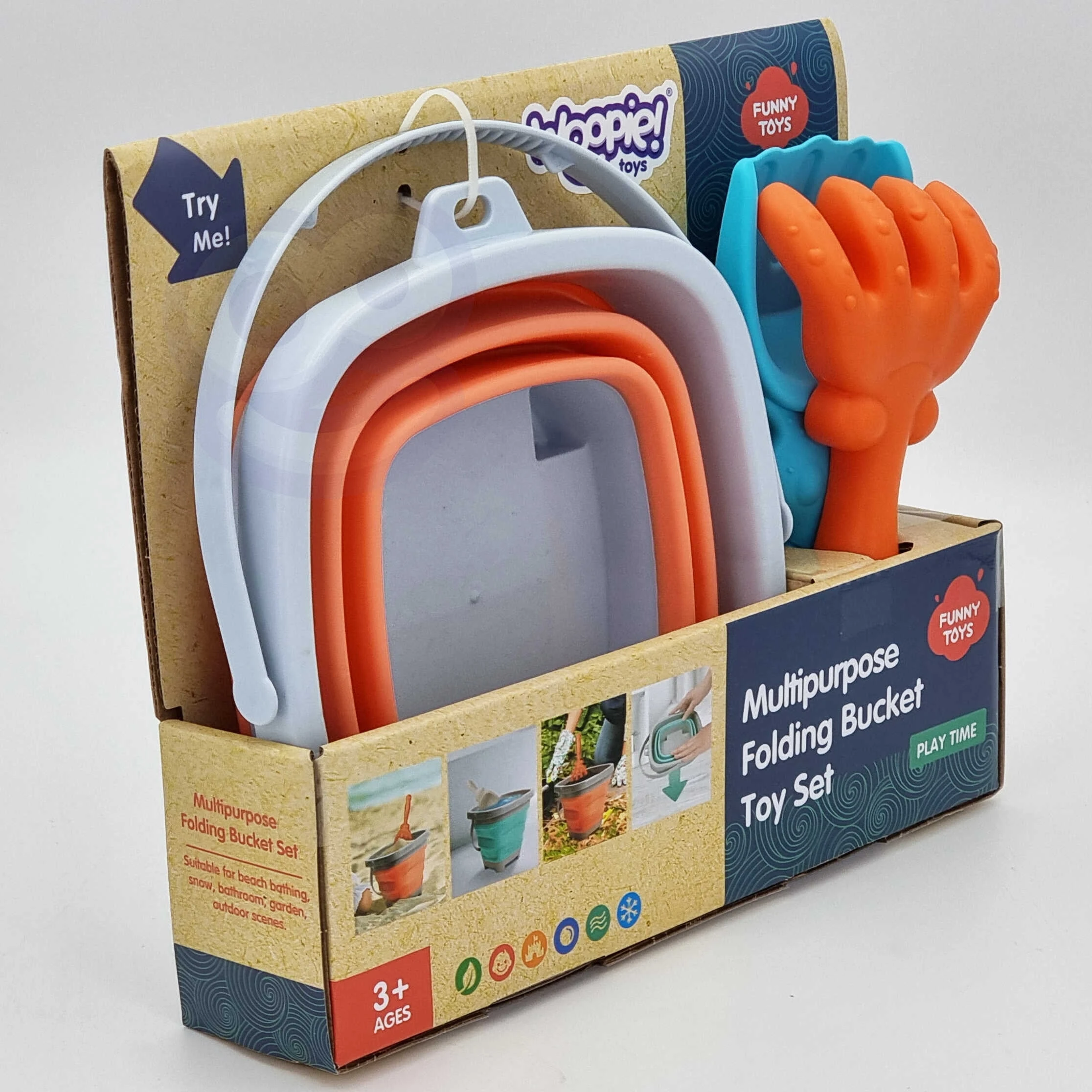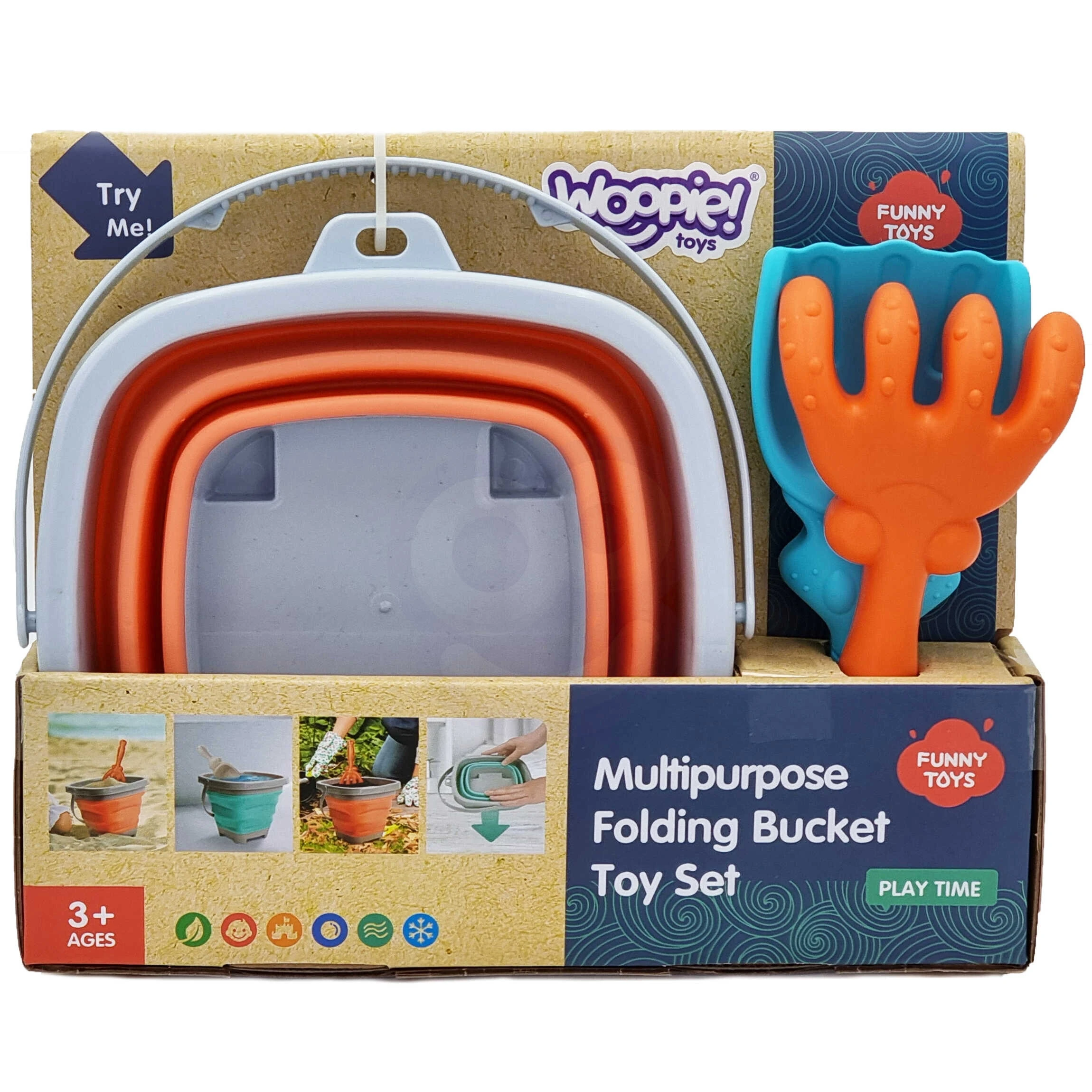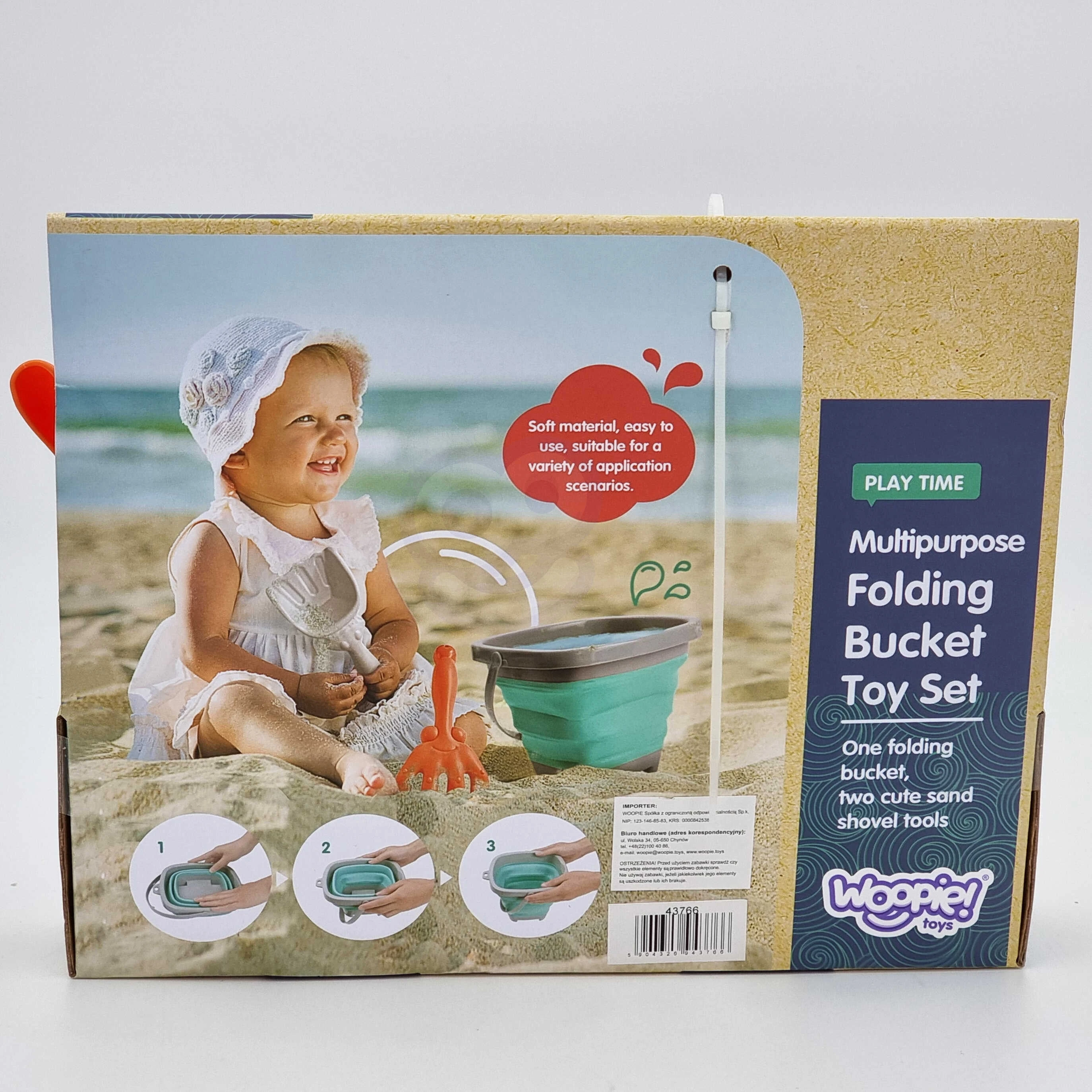 Silikonowe wiaderko z grabkami i łopatką od marki WOOPIE. Fantastyczne wiaderko do piaskownicy, na plażę lub do ogrodu, dzięki któremu dzieci miło spędzą czas na świeżym powietrzu. Wiaderko, dzięki składanej konstrukcji, zajmuje niewiele miejsca, jest łatwe w transporcie i wygodne do przechowywania.Zestaw zmieści się do dziecięcego plecaczka, do wózka czy plażowej torby.