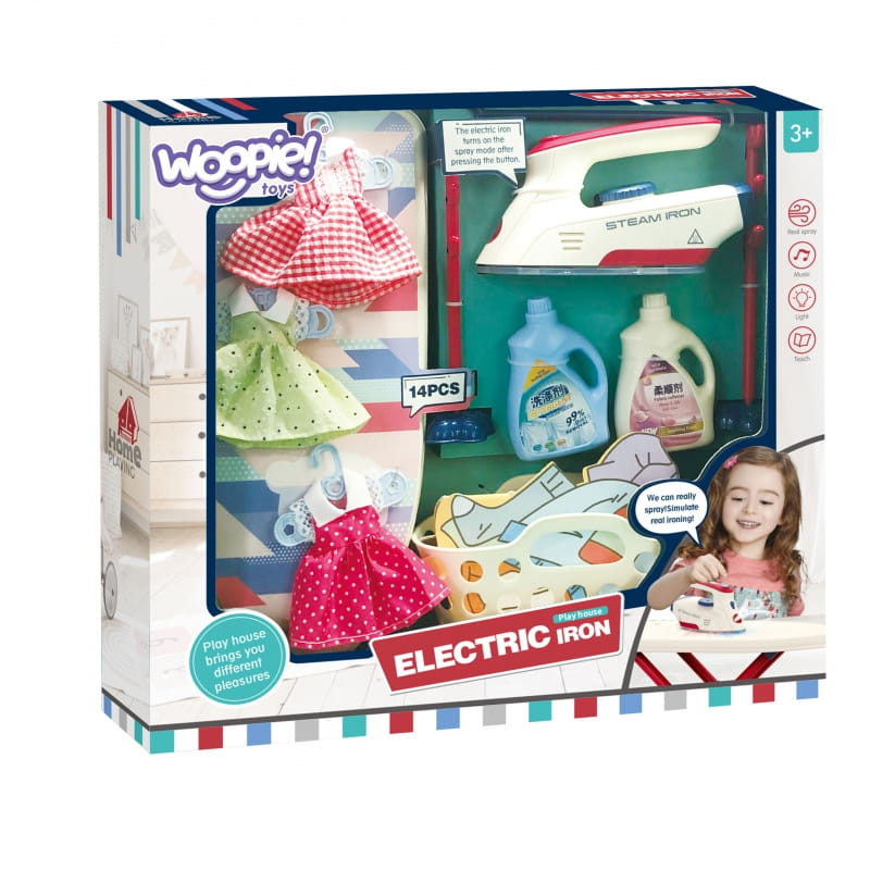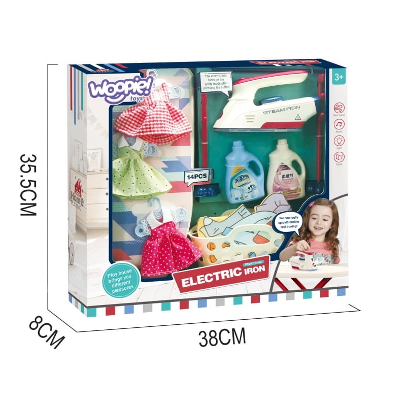 Zestaw do Prasowania od marki WOOPIE dostarczy dziecku mnóstwo zabawy w małą gospodynię domową. W zestawie znajdziemy żelazko, deskę do prasowania, kosz na pranie, stojący wieszak, trzy małe sukienki dla lalek oraz dwa opakowania płynu do prania. Żelazko jest zabawką bezpieczną dla dzieci, ponieważ nie nagrzewa się. Zostało ono wyposażona w wiele funkcji, które urozmaicą zabawę: 1 z przycisków znajdujący się na rączce żelazka który po wciśnięciu i trzymaniu odwzorowuje prawdziwe dźwięki prasowania, świecącą lampkę LED oraz efekty dźwiękowe w postaci piosenek. Jest to doskonały zestaw dla dzieci, które uwielbiają naśladować rodziców podczas codziennych czynności.