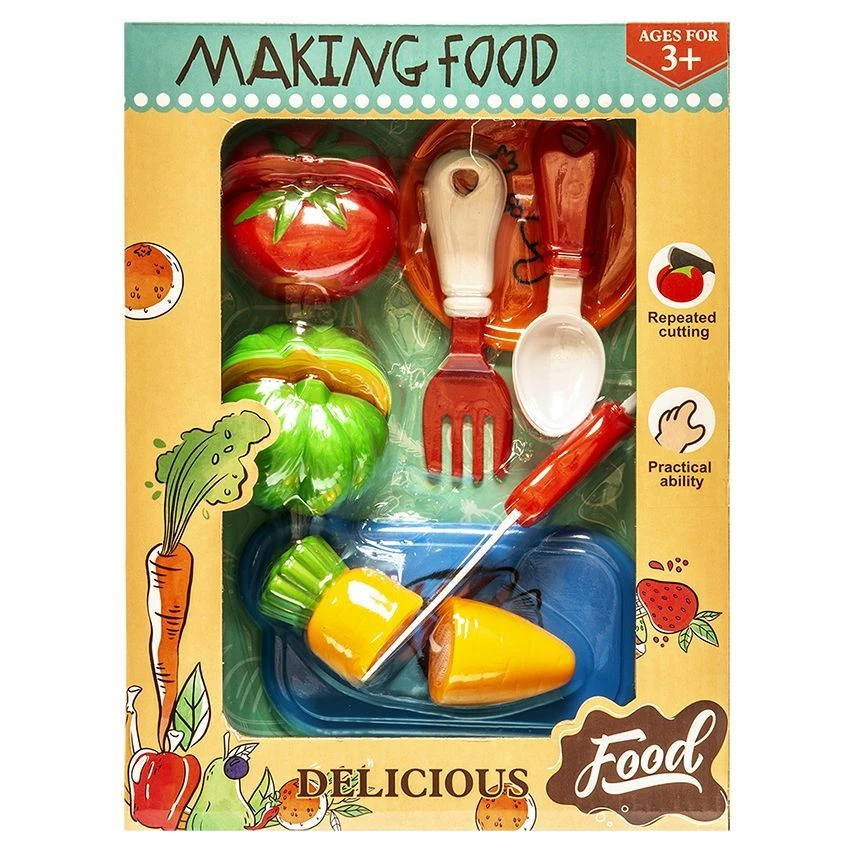 - zestaw kolorowych warzyw – 3 precyzyjnie odwzorowane: marchew (9 cm), dynia (6 cm) i pomidor (6 cm) oraz akcesora w postaci: deski do krojenia o wymiarach: 13 x 7,5 cm, nóż o długości 14 cm, łyżka o długości 11 cm, widelec o długości 11 cm i talerz o średnicy około 9 cm umożliwia interesującą zabawę w dom lub w gotowanie; żywe i soczyste kolory przyciągną uwagę dziecka i zachęcą do zabawy,