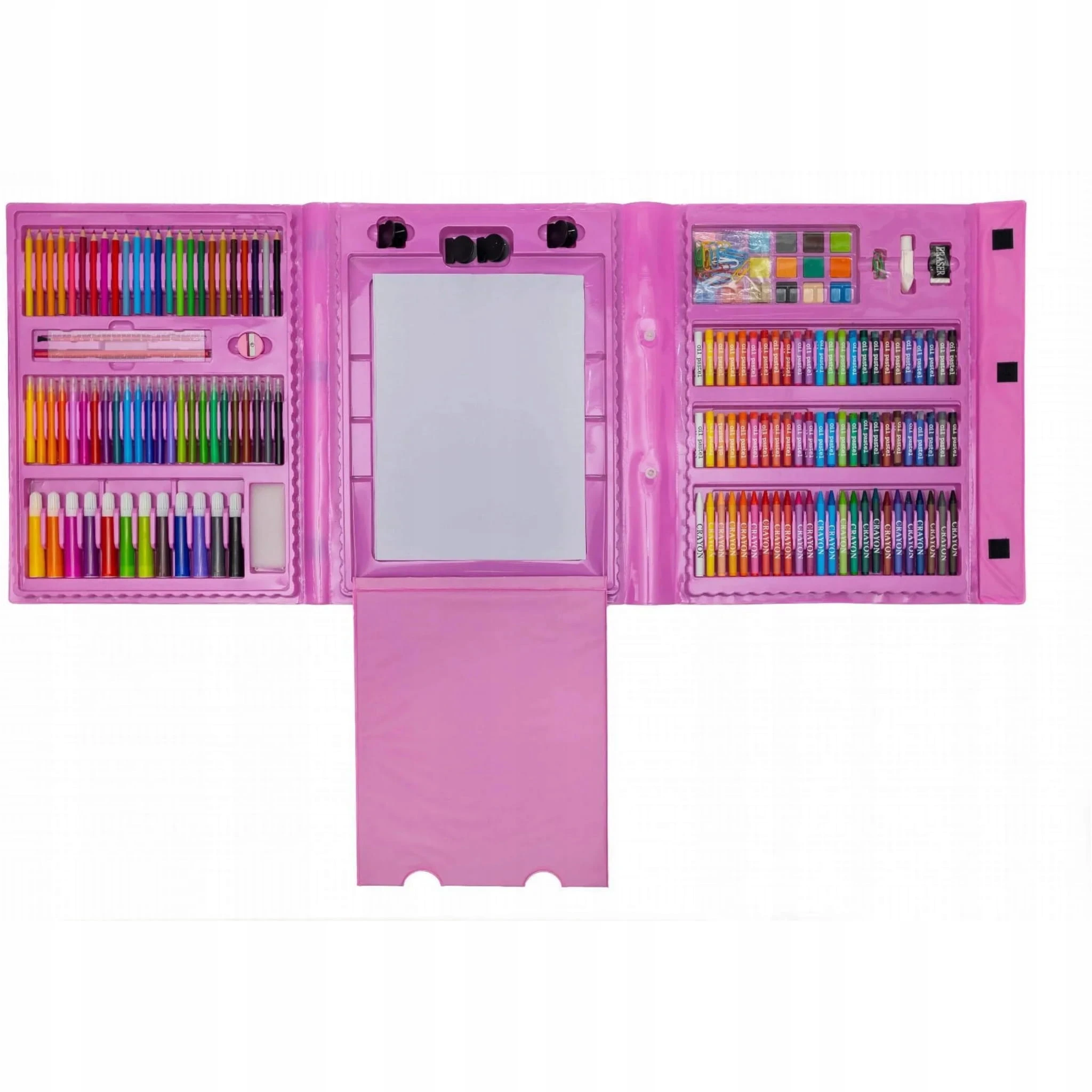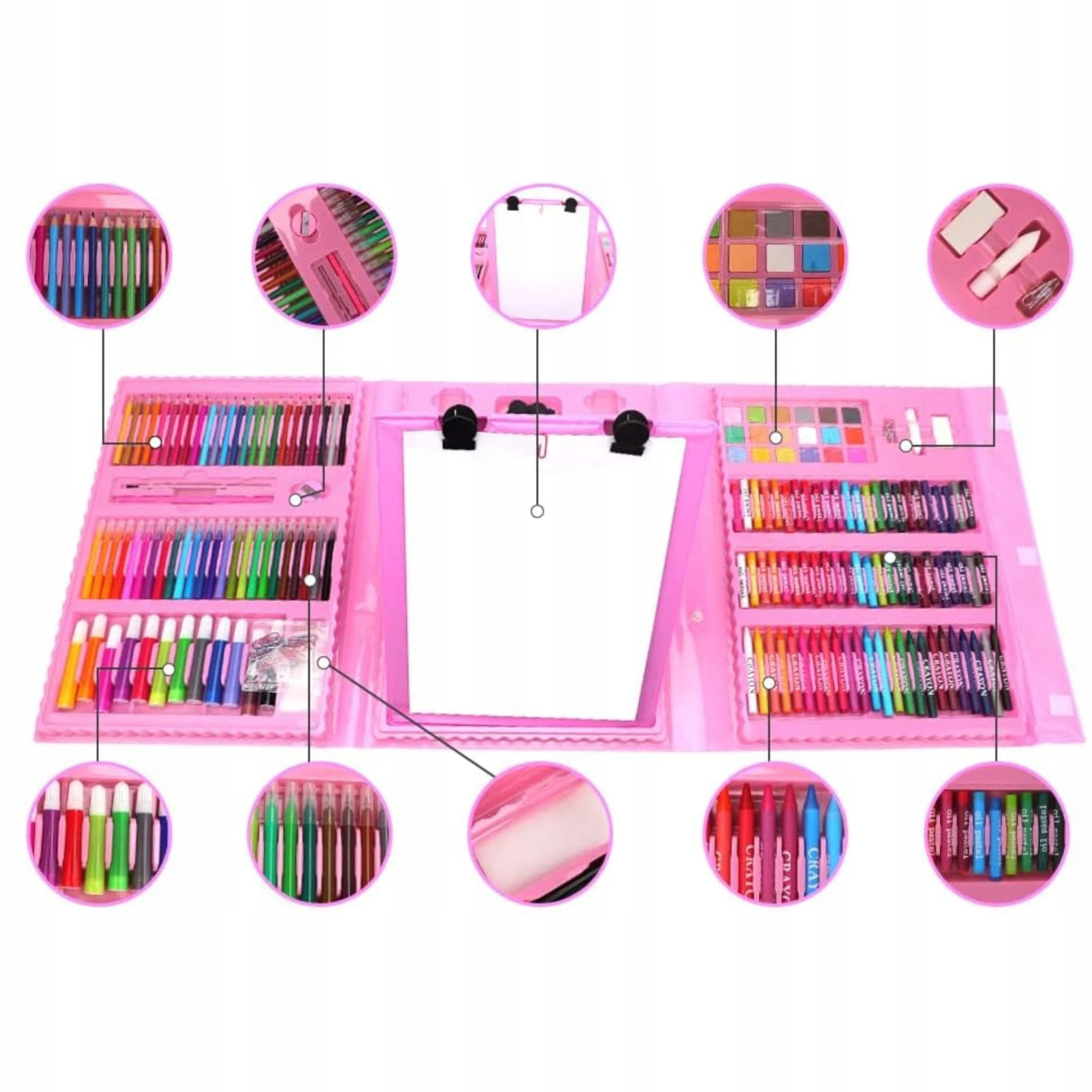 Zestaw artystyczny aż 203 elementów do malowania w walizce to świetny sposób na naukę poprzez zabawę dla Twojego dziecka. Duży zestaw akcesoriów artystycznych już od najmłodszych lat pobudza wyobraźnie, ćwiczy kreatywność oraz koncentrację. Edukacyjna zabawka, która rozwinie w dziecku zdolności plastyczne, które zaowocują w dalszej nauce w przedszkolu, a później w szkole. Walizka w ładnych odcieniach koloru różowego to idealny prezent dla każdego dziecka, które lubi rysować.