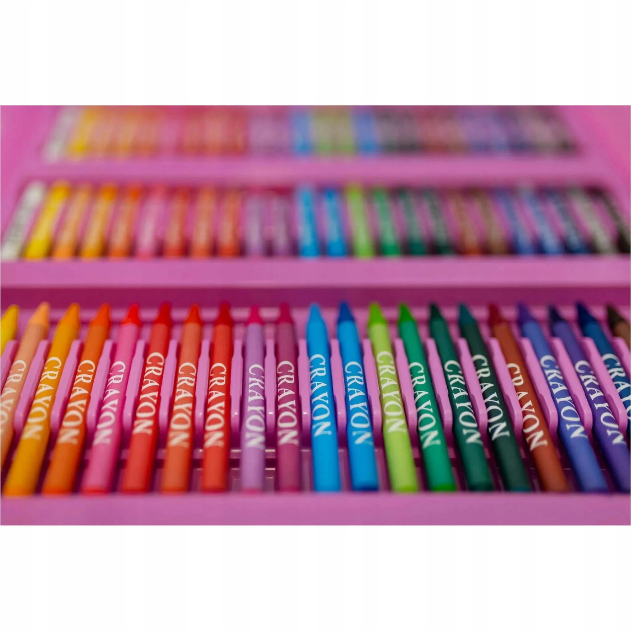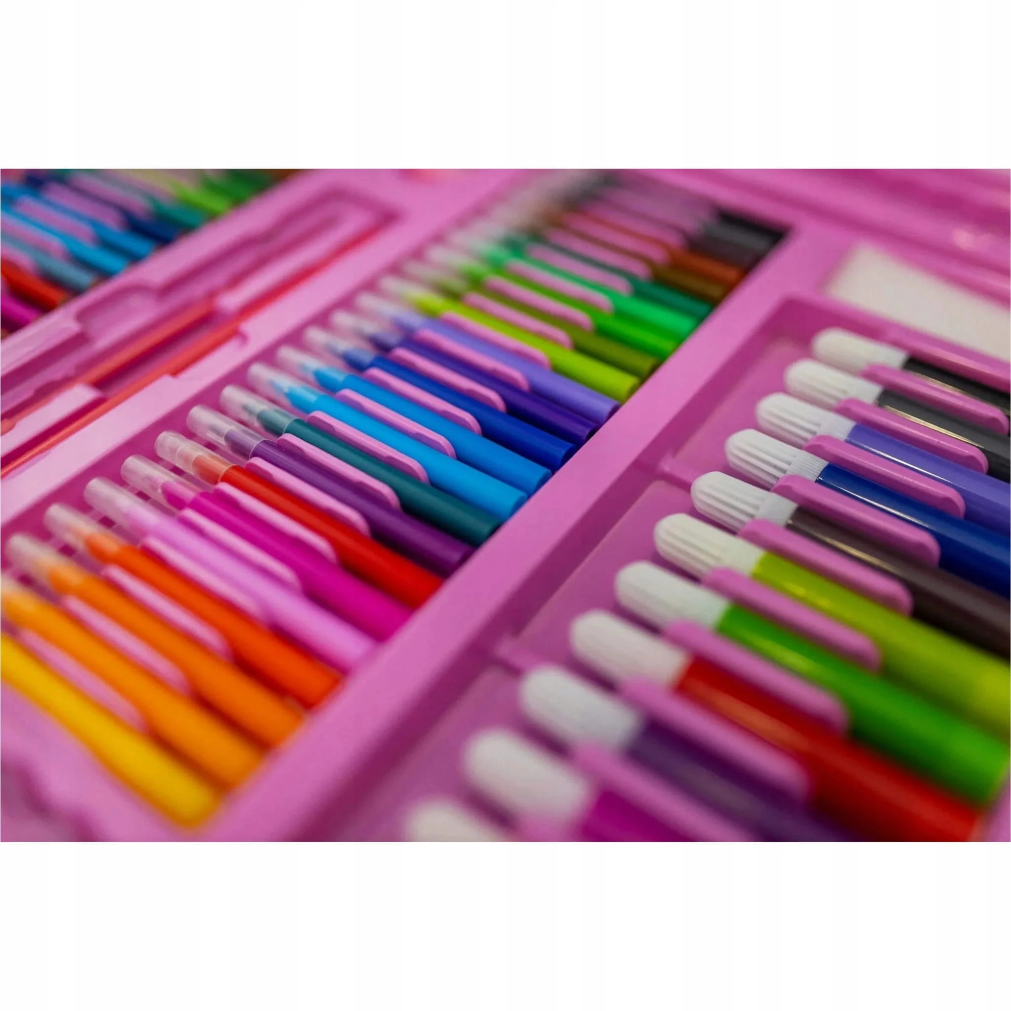 Zestaw 203 elementów jest zapakowany w poręczną walizkę z rączką zapinaną rzepy. Pozwala to zabrać ulubione przybory do rysowania w każde miejsce w domu, do ogrodu, do szkoły, na wyjazd czy na spotkanie z przyjaciółmi. W walizce każdy element ma przypisane swoje miejsce, co ułatwia znalezienie konkretnej kredki czy farby. To rozwiązanie pozwala także na utrzymanie porządku i pomaga w sprzątaniu po skończonej zabawie – wystarczy odłożyć każdą rzecz do jej zagłębienia.