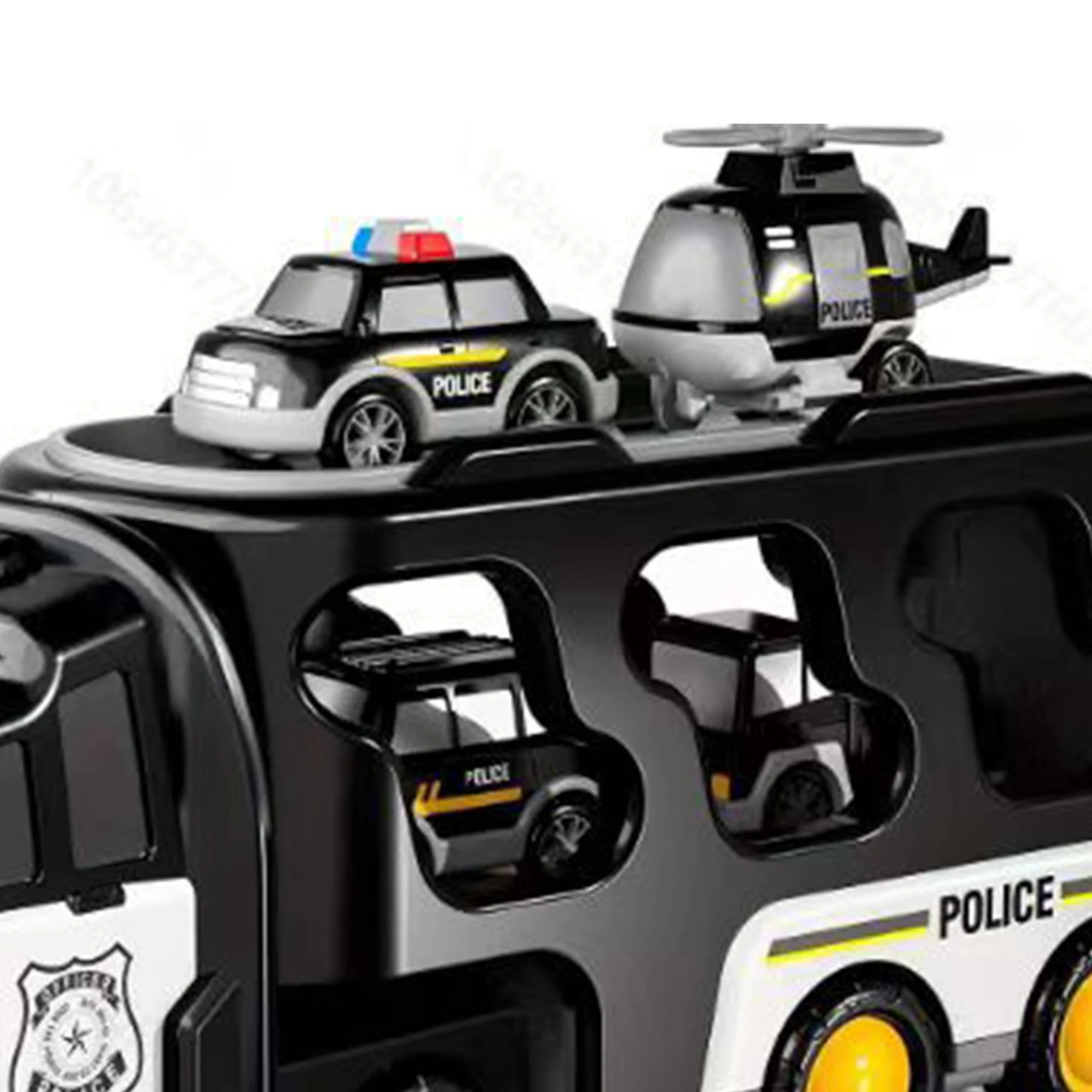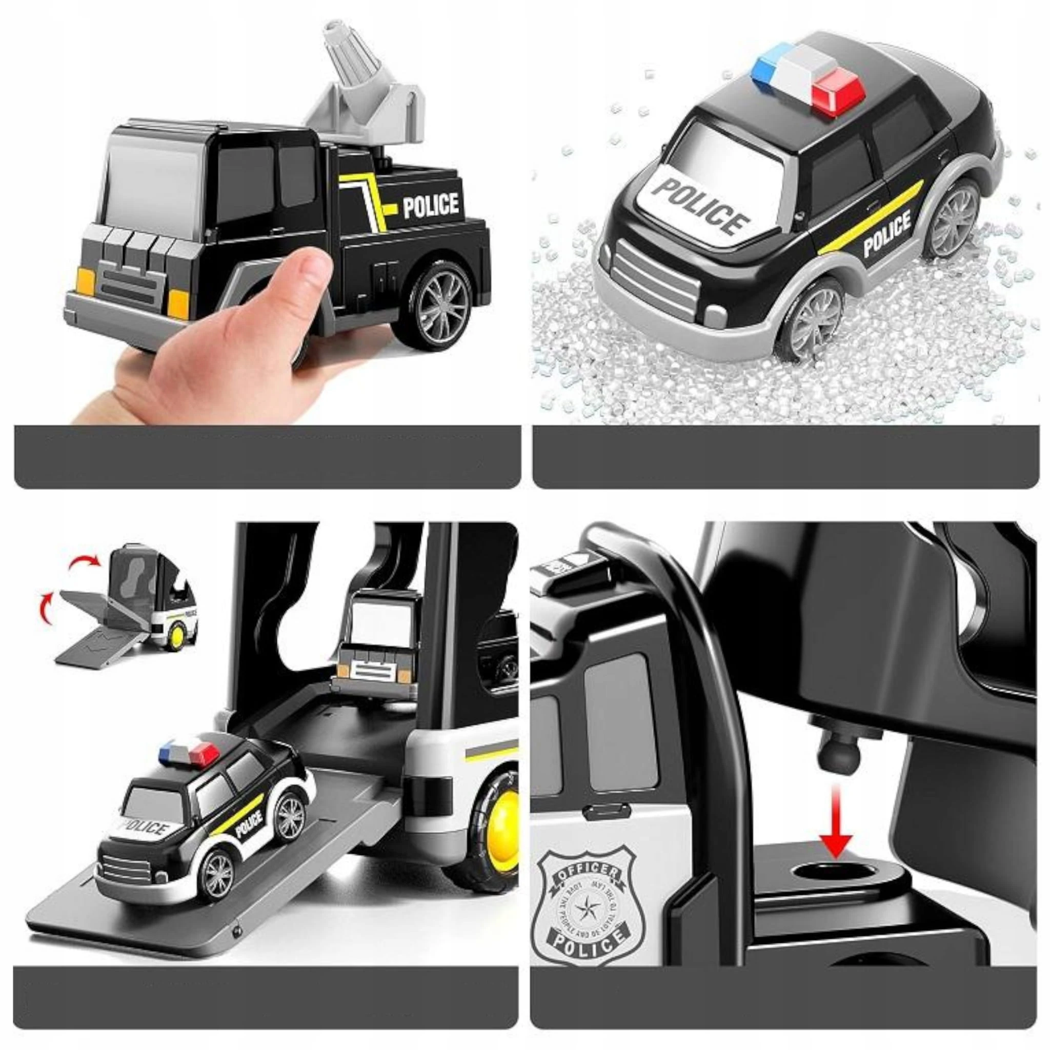 Tylna klapa lawety jest otwierana, co pozwala na wygodne załadunek i transport wszystkich dołączonych pojazdów policyjnych. Dziecko może samodzielnie umieszczać autka w środku lub je z niego wyciągać, co dodaje zabawie elementu logistyki i organizacji akcji.