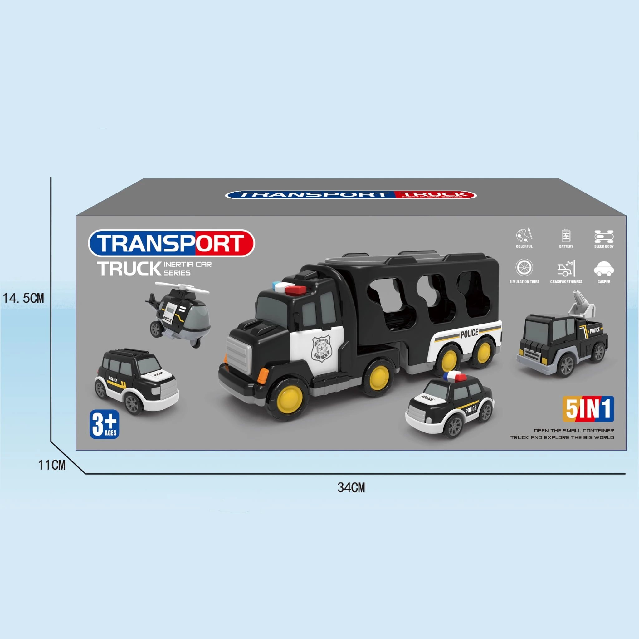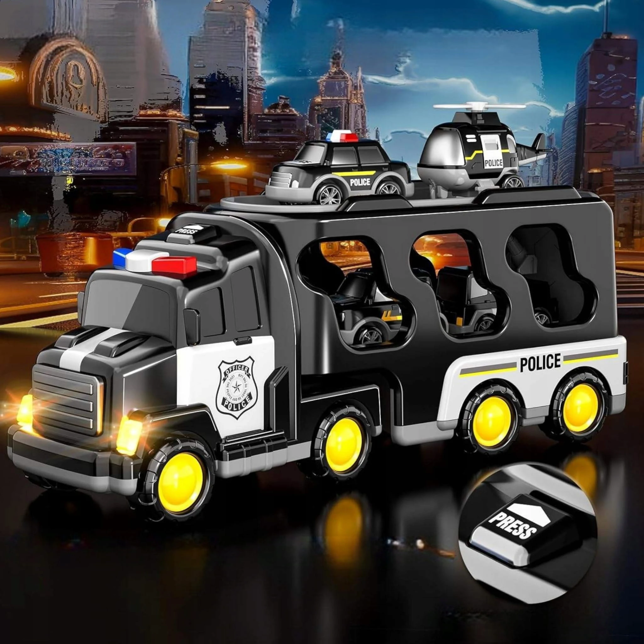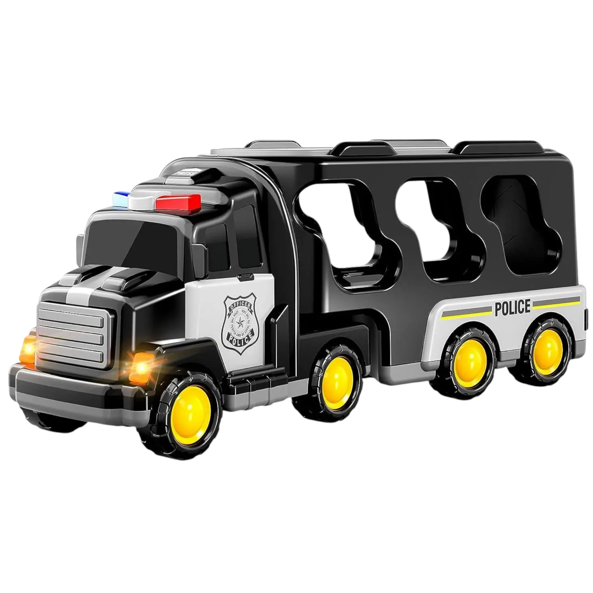 Wystarczy nacisnąć przycisk umieszczony na górze kabiny głównej ciężarówki, aby uruchomić efekty świetlne i dźwiękowe –migające światła ostrzegawcze oraz realistyczny dźwięk natychmiast wprowadzają w klimat akcji policyjnej.