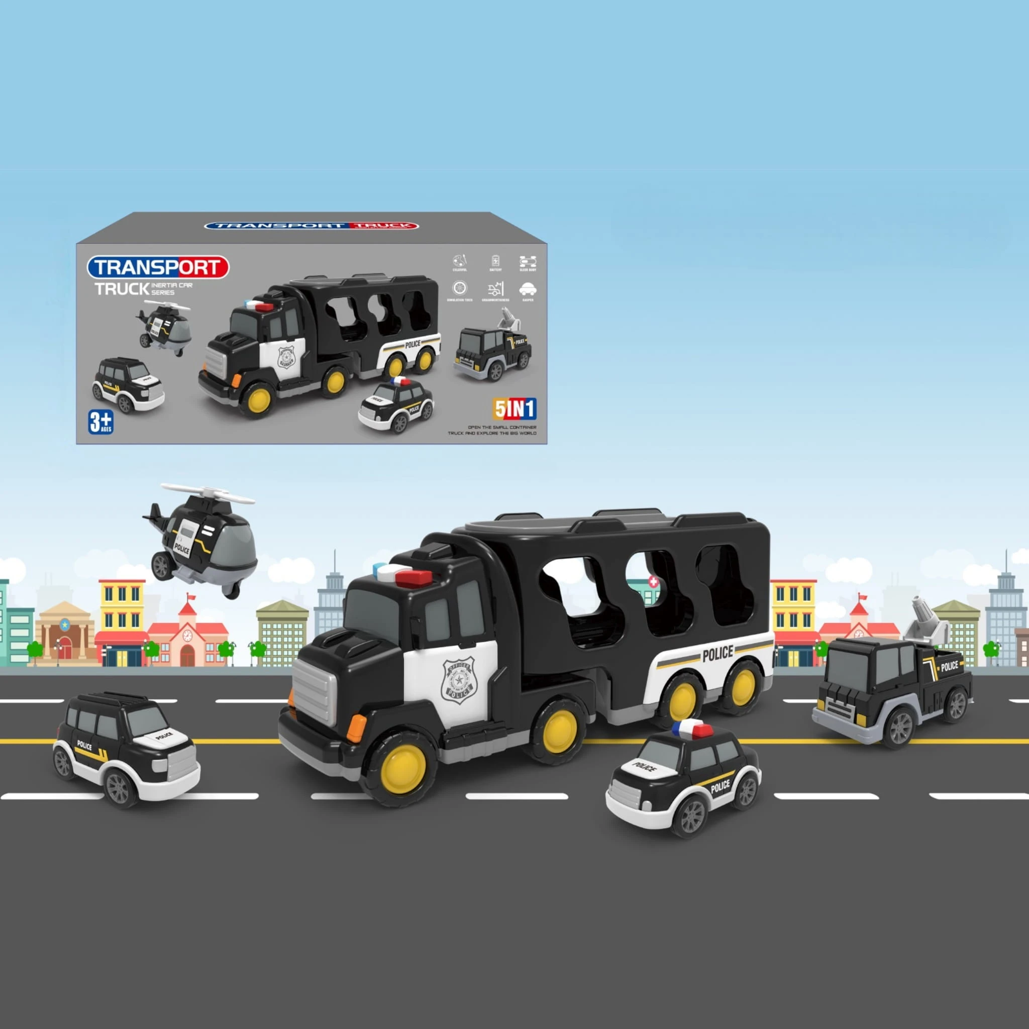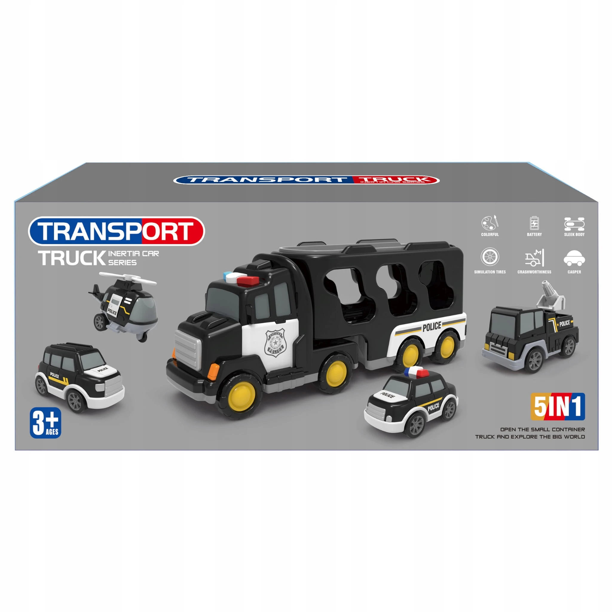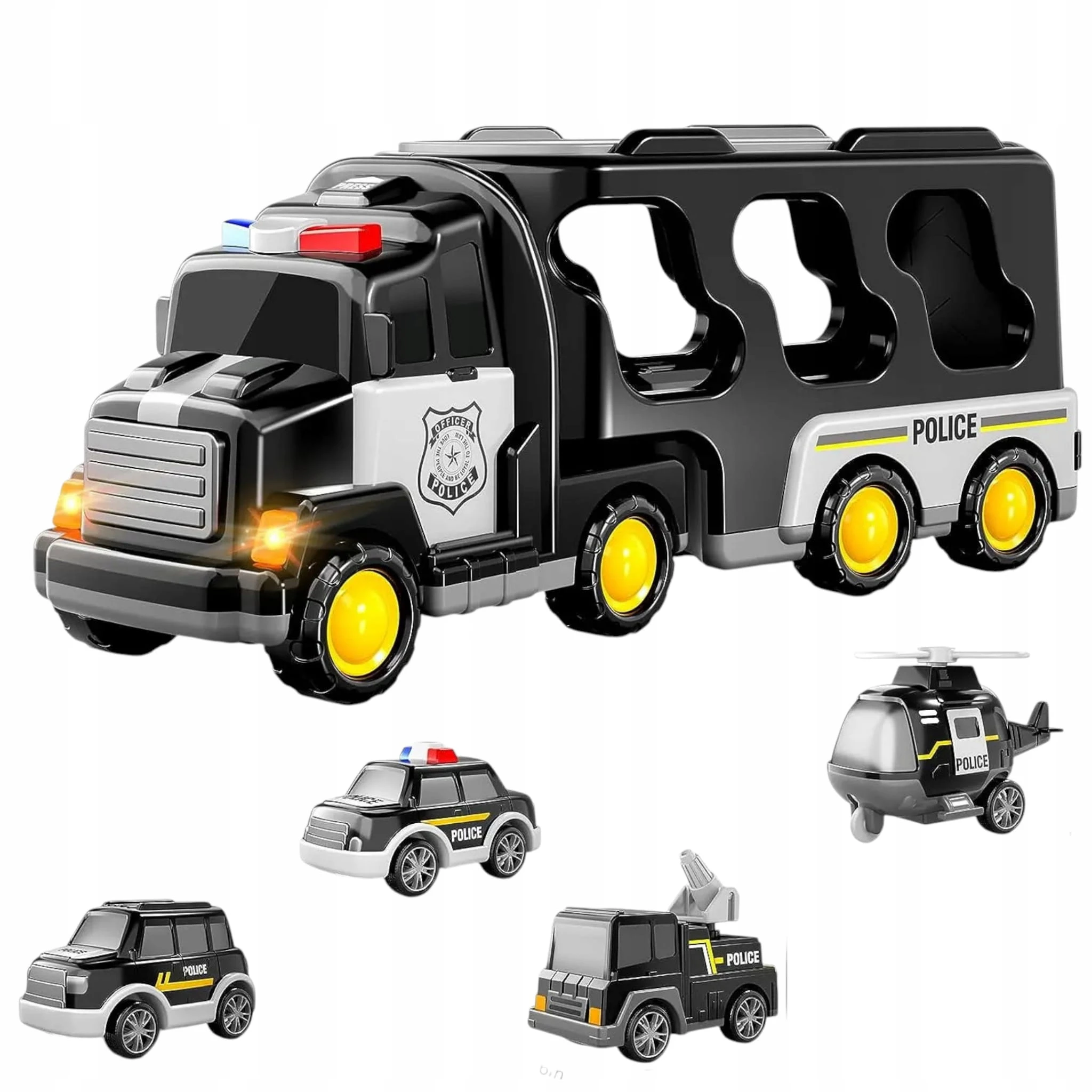 ✅Zestaw zawiera 1 dużą lawetę i 4 pojazdy policyjne – różnorodność pojazdów pozwala na tworzenie wielu scenariuszy zabawy.