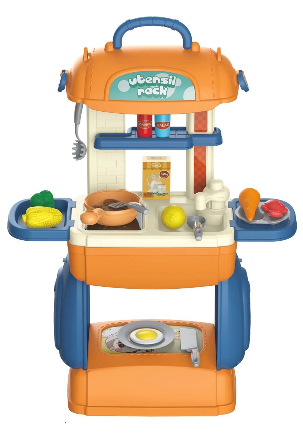 W zestawie znajdują się najpotrzebniejsze przybory kuchenne, między innymi patelnia, talerz, chochelka, tasak oraz imitacja produktów spożywczych takich jak: kukurydza, brokuł, cytryna, ryba i marchew.