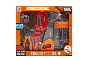 W skład zestawu wchodzą plastikowe narzędzia, będące imitacjami prawdziwych przyrządów każdego majsterkowicza. Charakteryzują się przyjaznymi kształtami i żywą kolorystyką. Wykonany z wysokiej jakości plastiku, zapewnia długie użytkowanie. Ten kolorowy zestaw to gwarancja wspaniałej zabawy przez długie godziny.